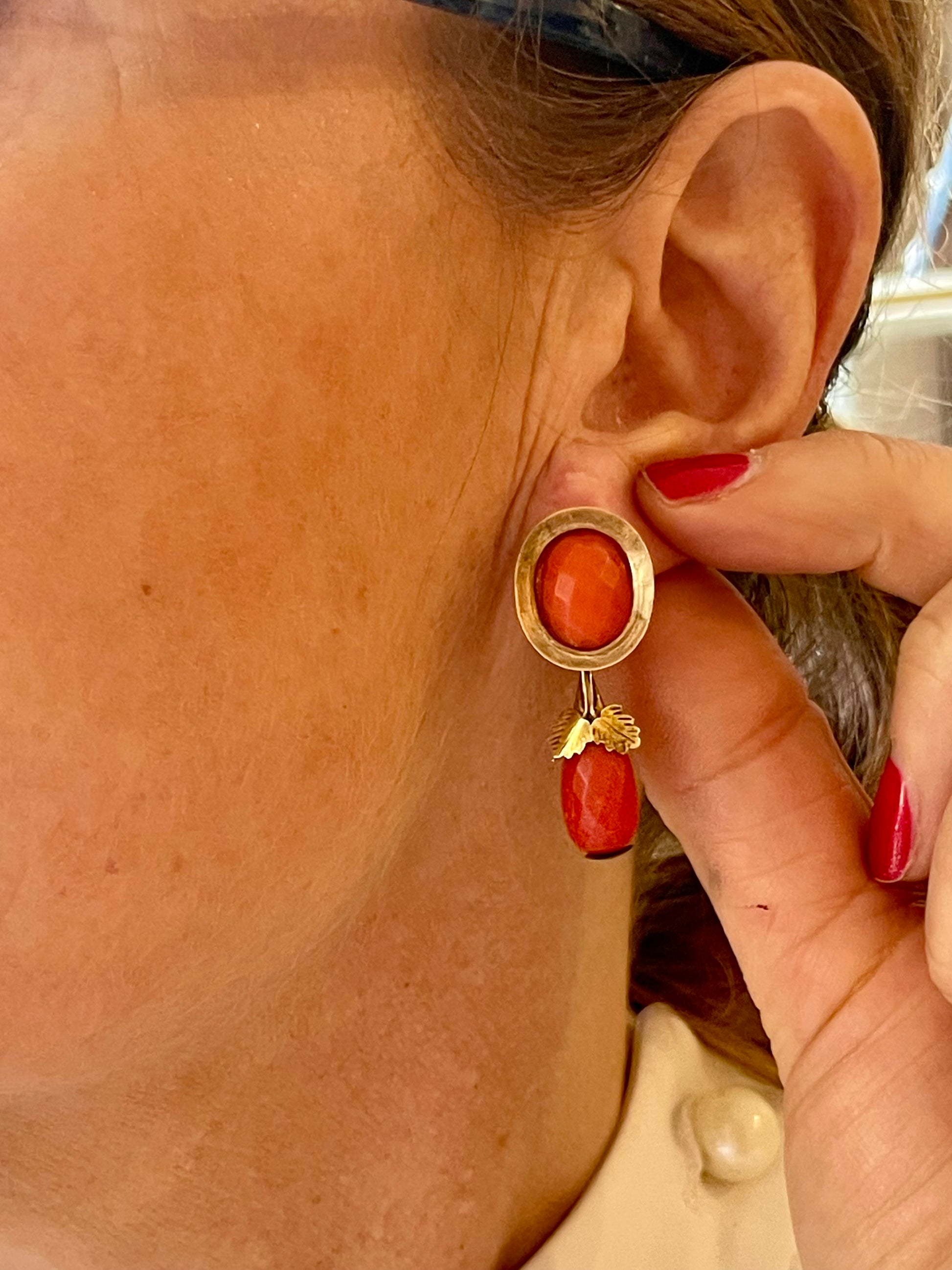 Qui, la parte superiore a lobo presenta una pastiglia di corallo rosso naturale sfaccettato, montata con una cornice liscia. Il pendente è formato da una goccia sempre sfaccettata, incorniciata tra due piccole foglie.