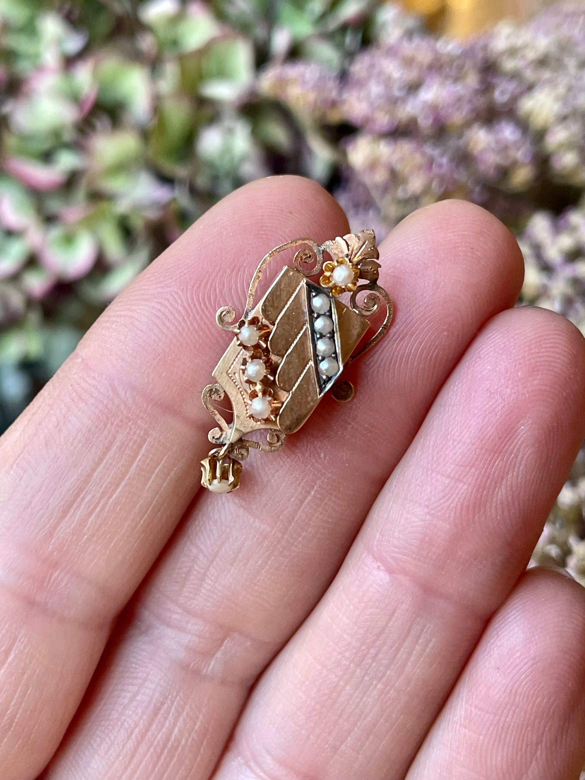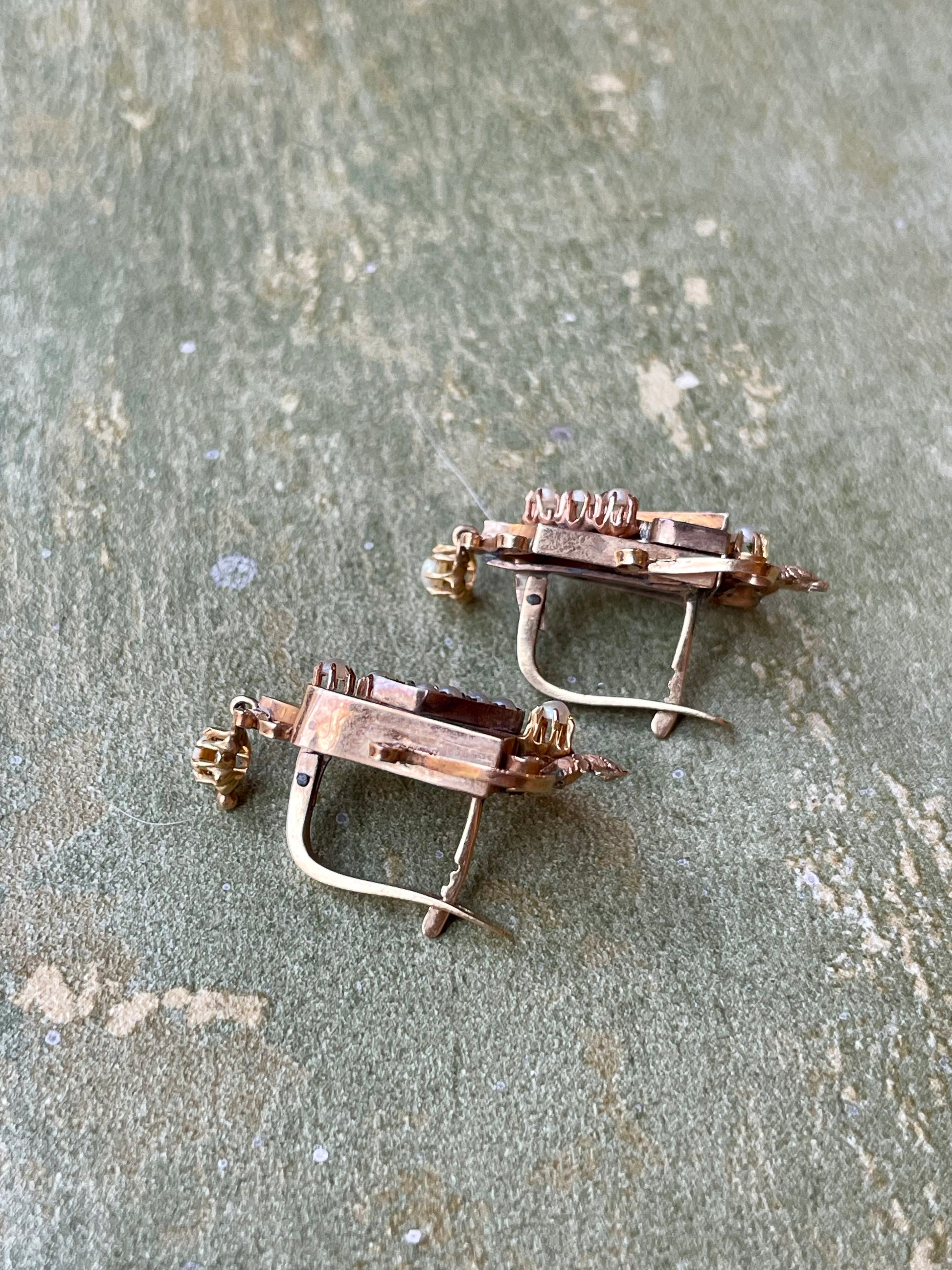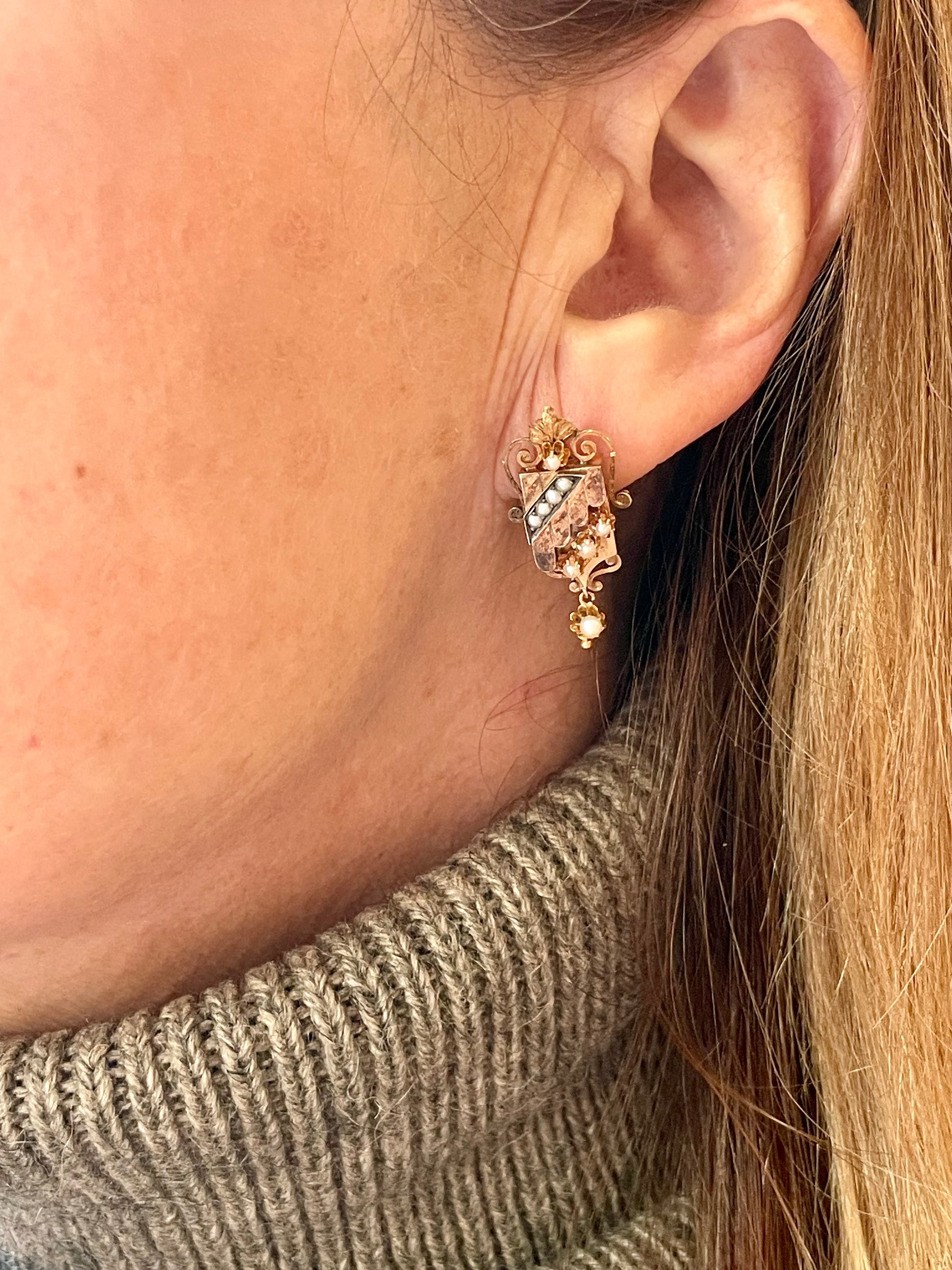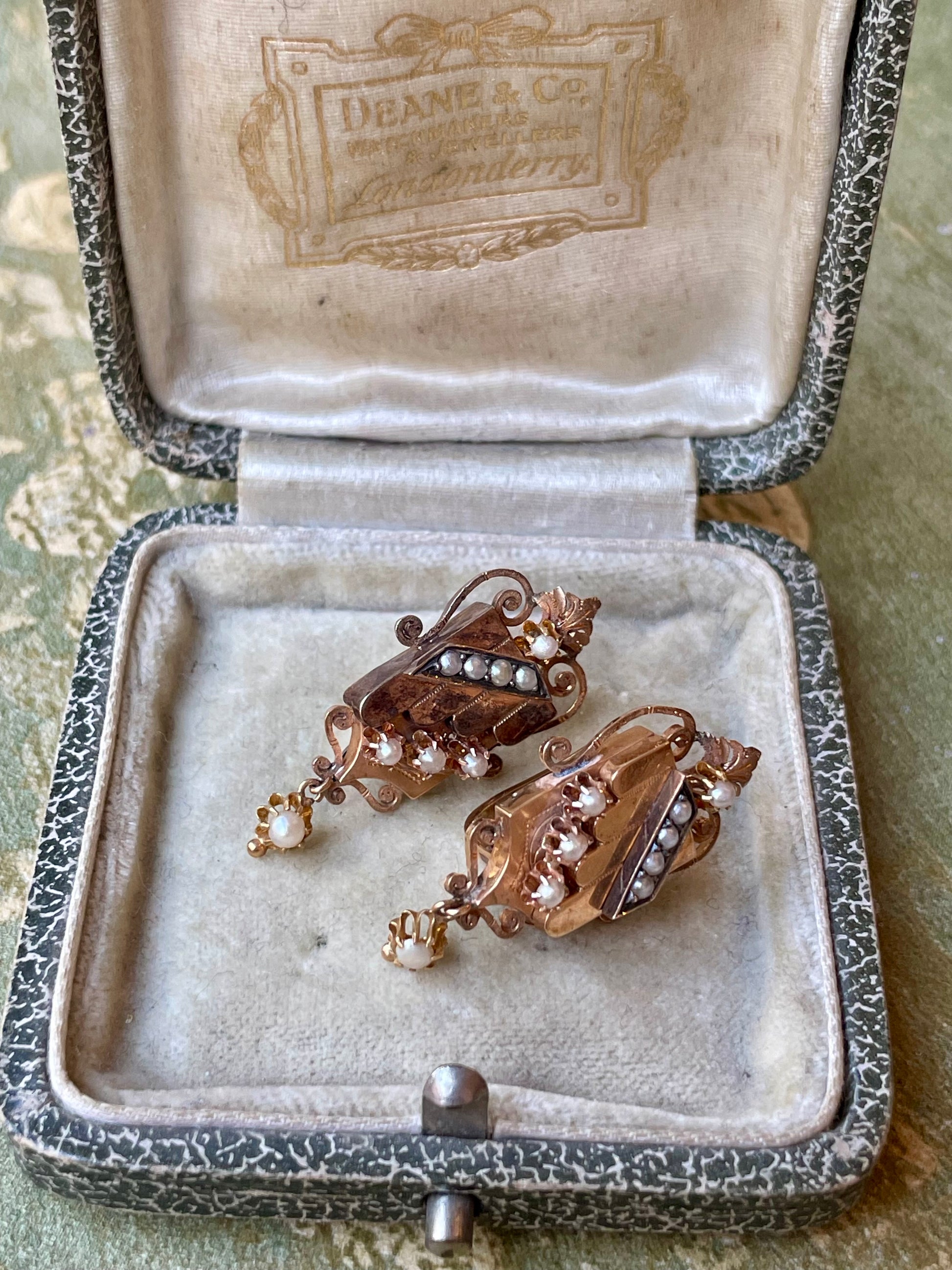 Orecchini traversine in lamina d’oro rosa e perle, epoca vittoriana