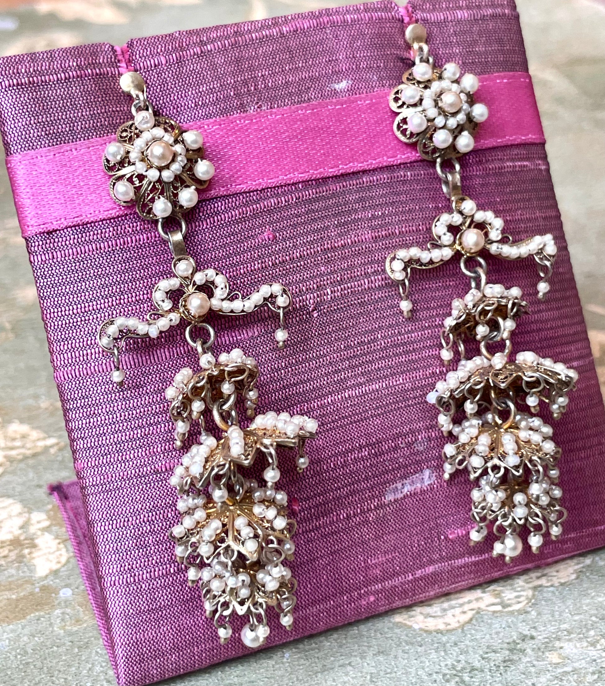 Realizzati in filigrana d’argento dorato, sembrano essere ricamati con i luminosi semi di perle che li ricoprono completamente.