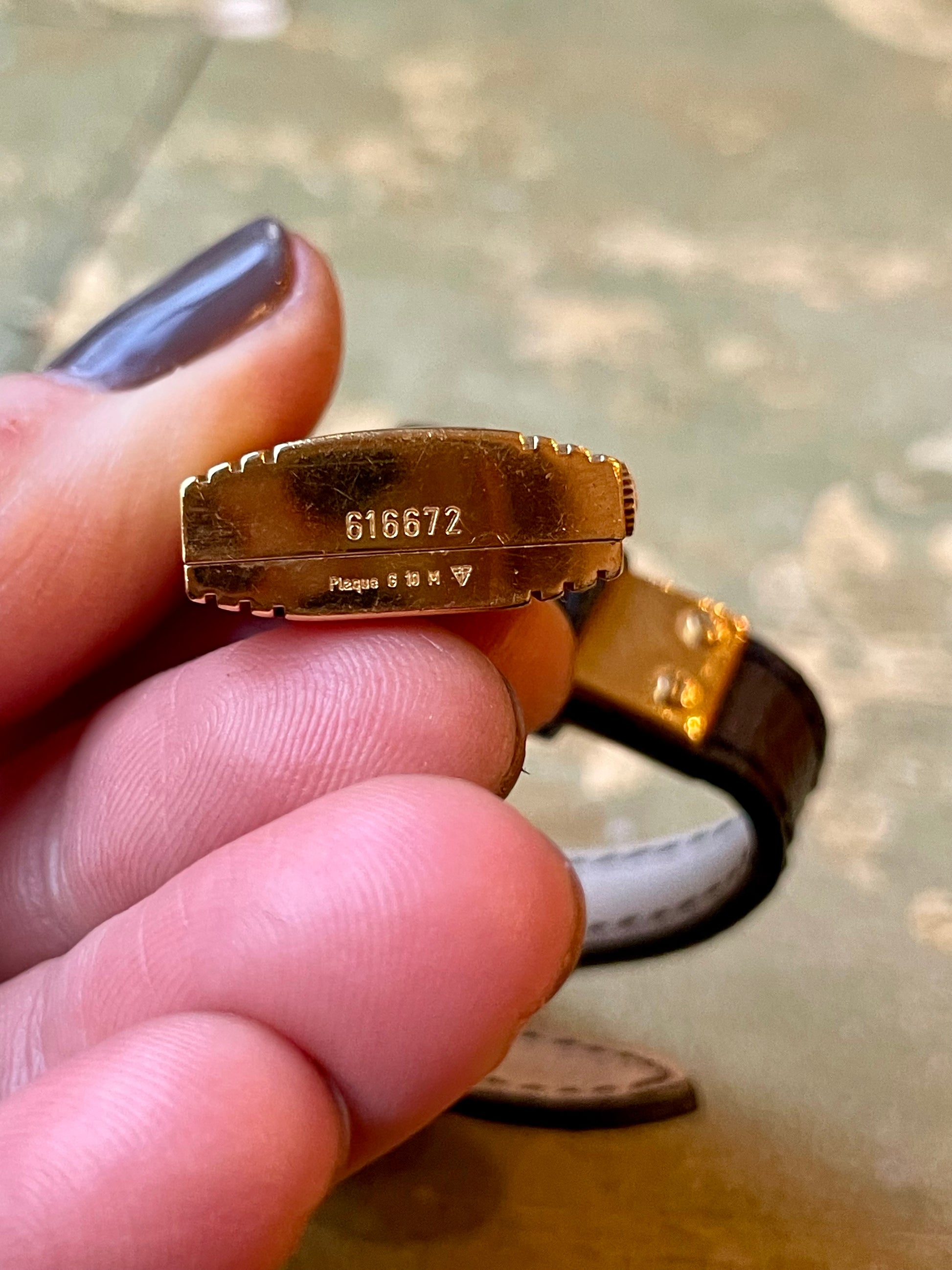 Il bracciale in pelle nera in perfette condizioni, è anch’esso firmato; l’orologio a quarzo ha la cassa in metallo dorato ed è perfettamente funzionante.