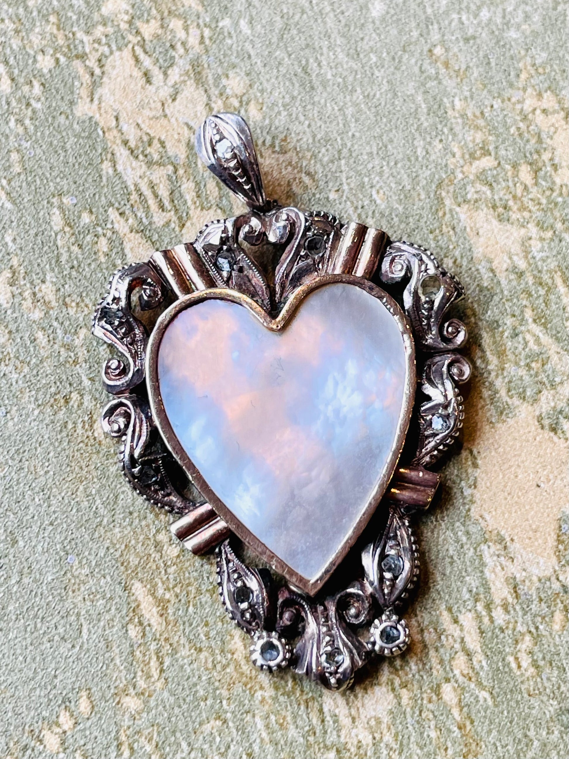 Pendente con cuore in madreperla, oro rosa e argento, epoca edoardiana