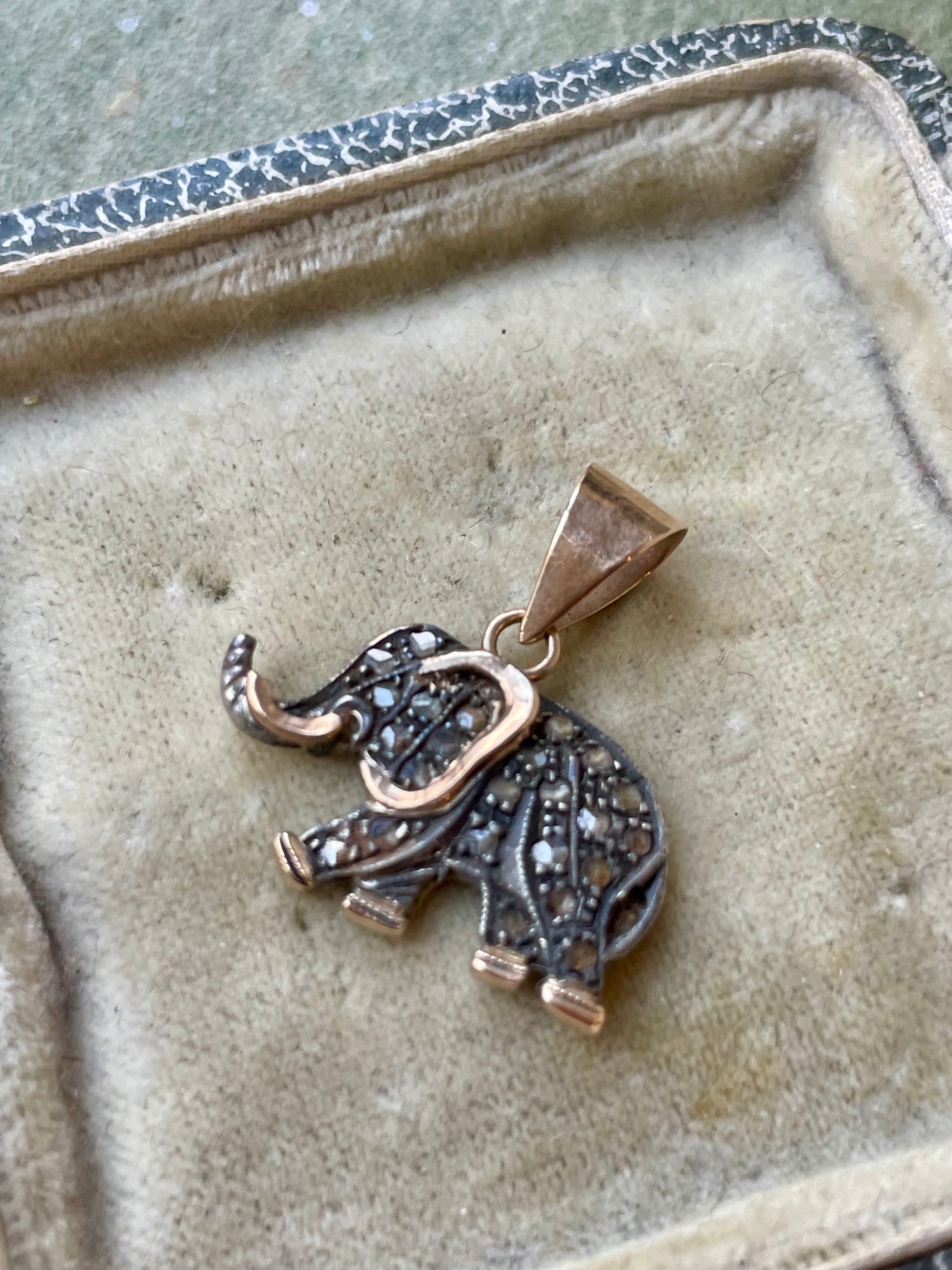 Pendente Elefante placcato oro rosa, argento e rosette di diamanti, anni ‘40/50