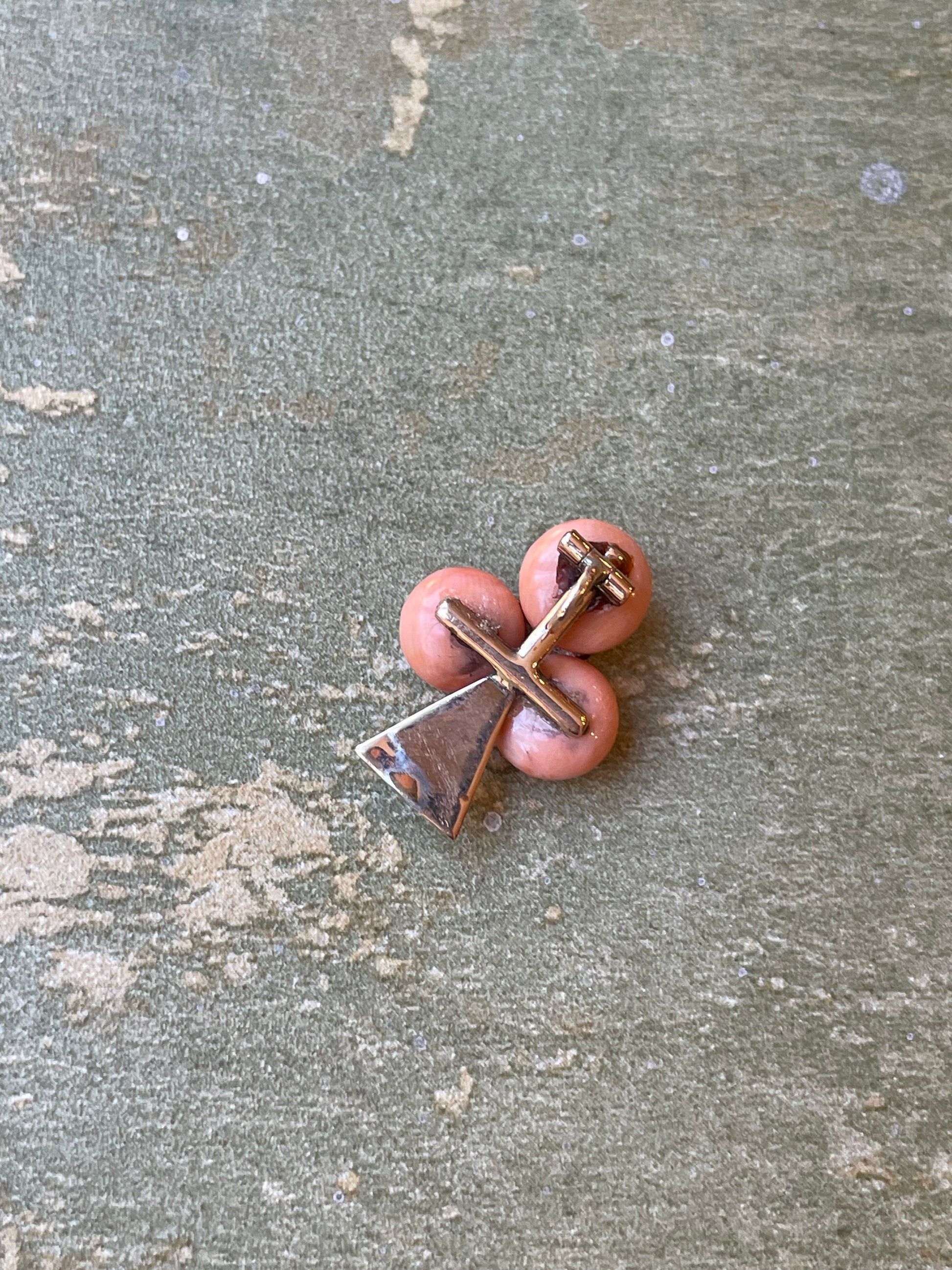 Un romantico gioiello porta fortuna, dalla forma originale a trifoglio.Realizzato in oro giallo, presenta tre pastiglie di corallo rosa naturale e piccole perle bianche .