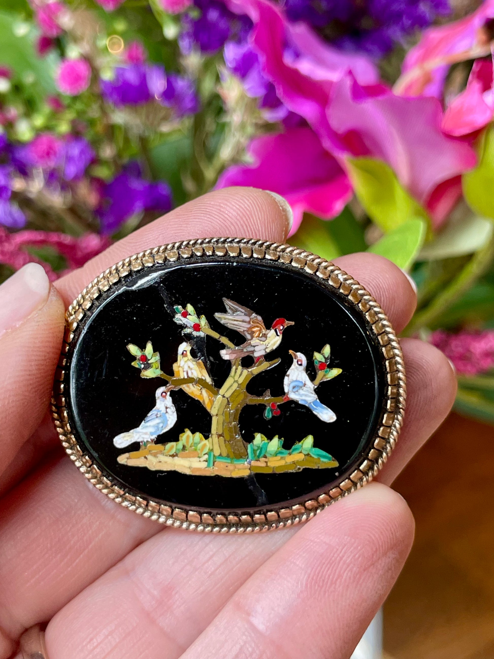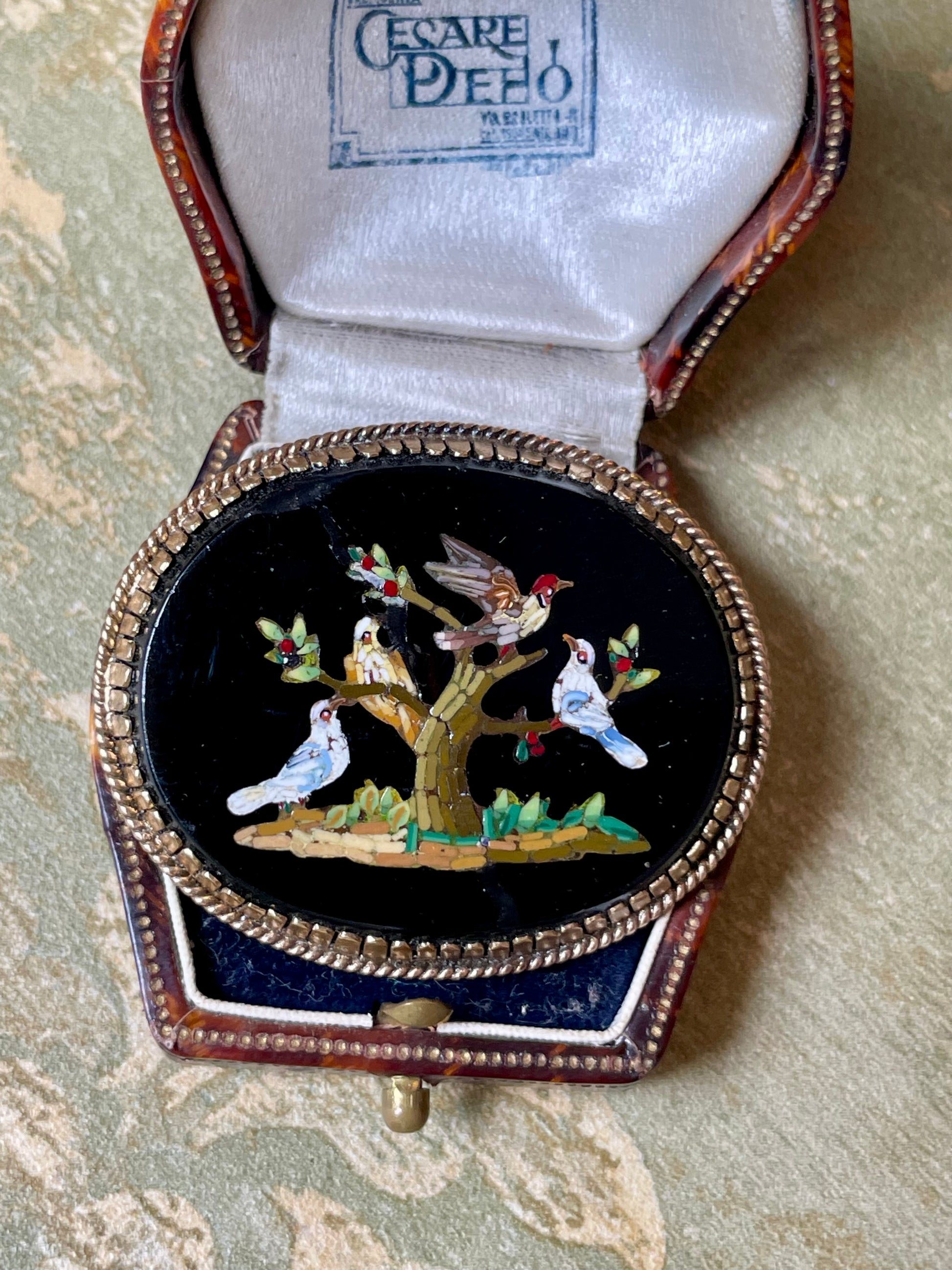 Raffinata spilla in micromosaico con uccellini, Roma, prima metà dell’Ottocento