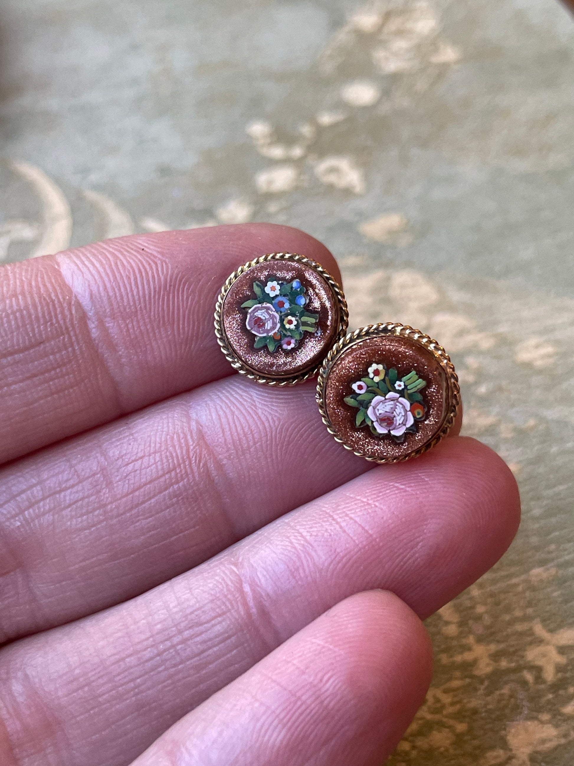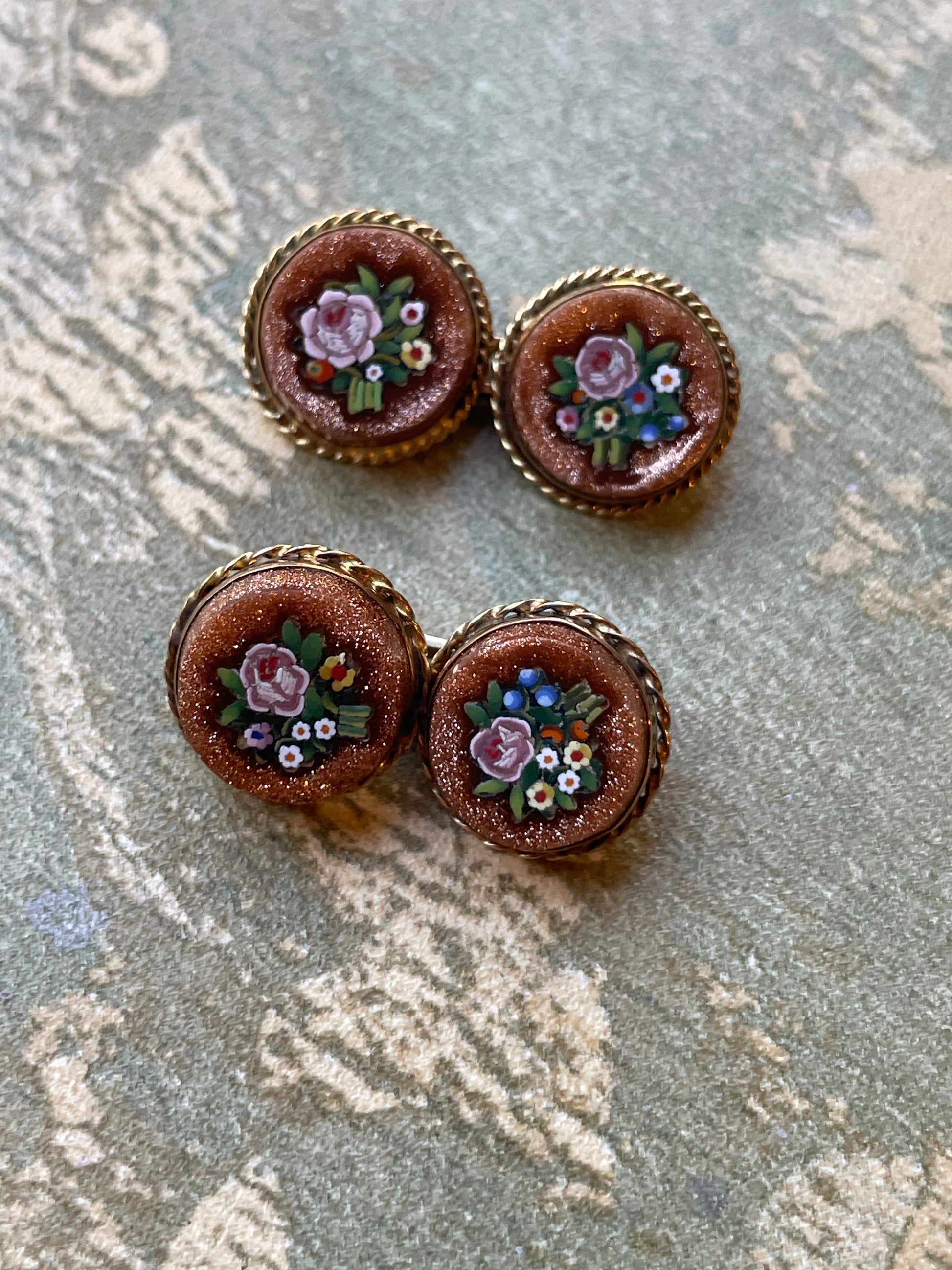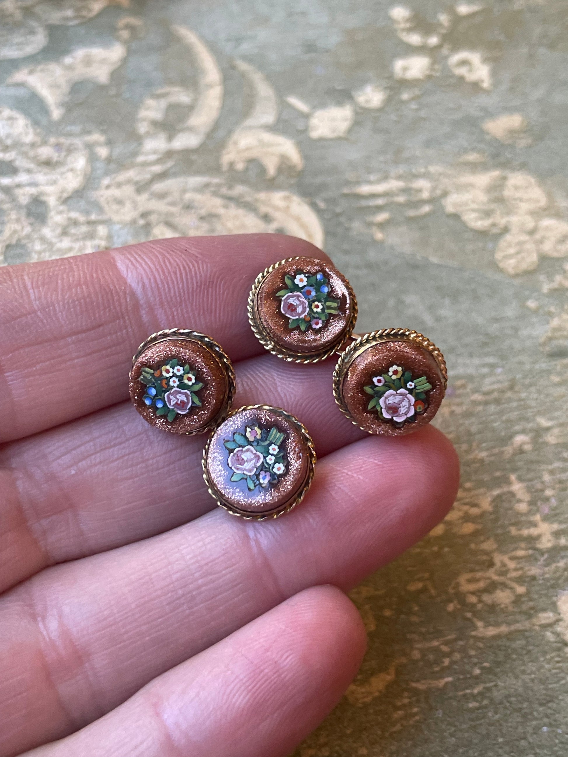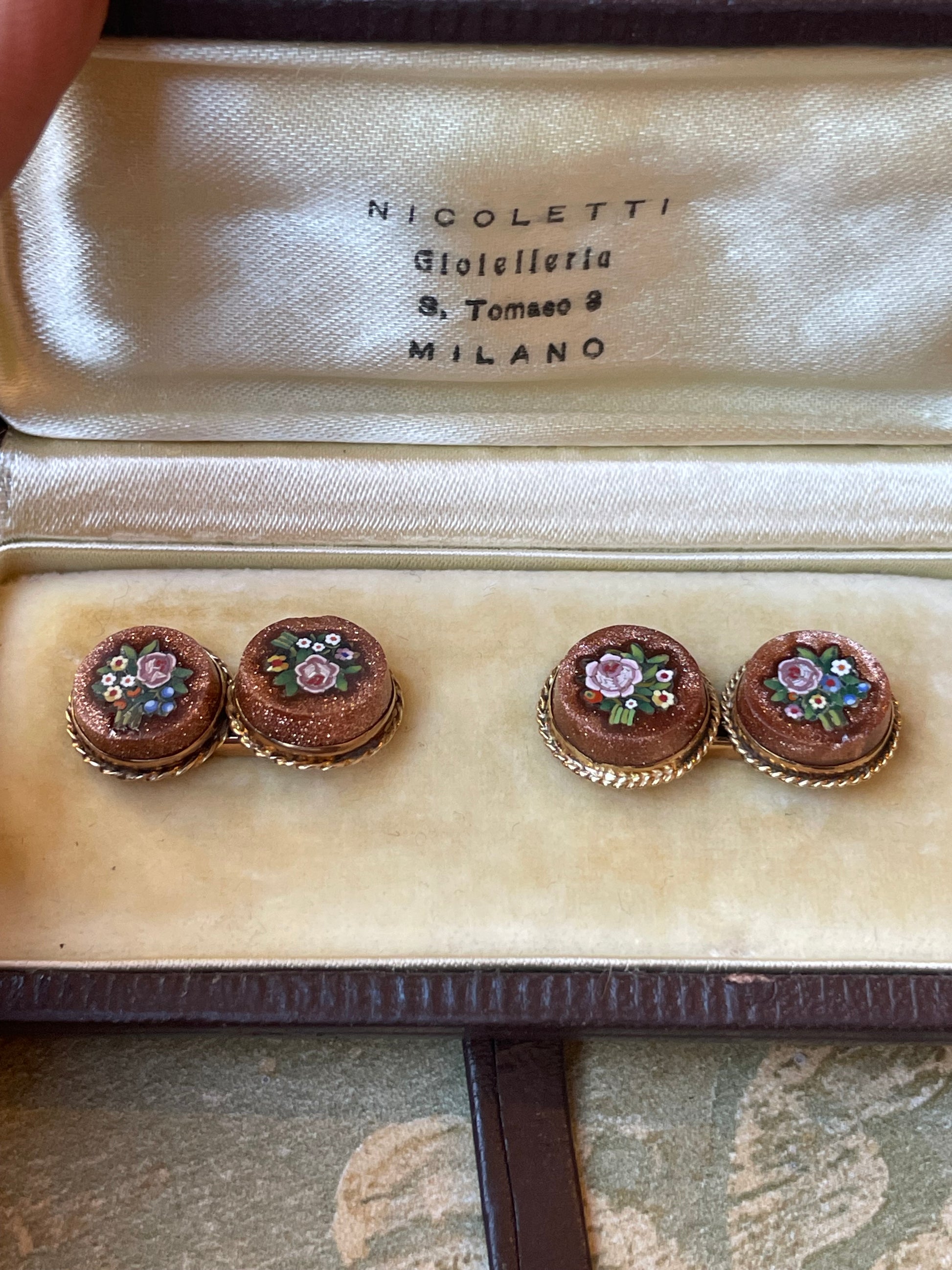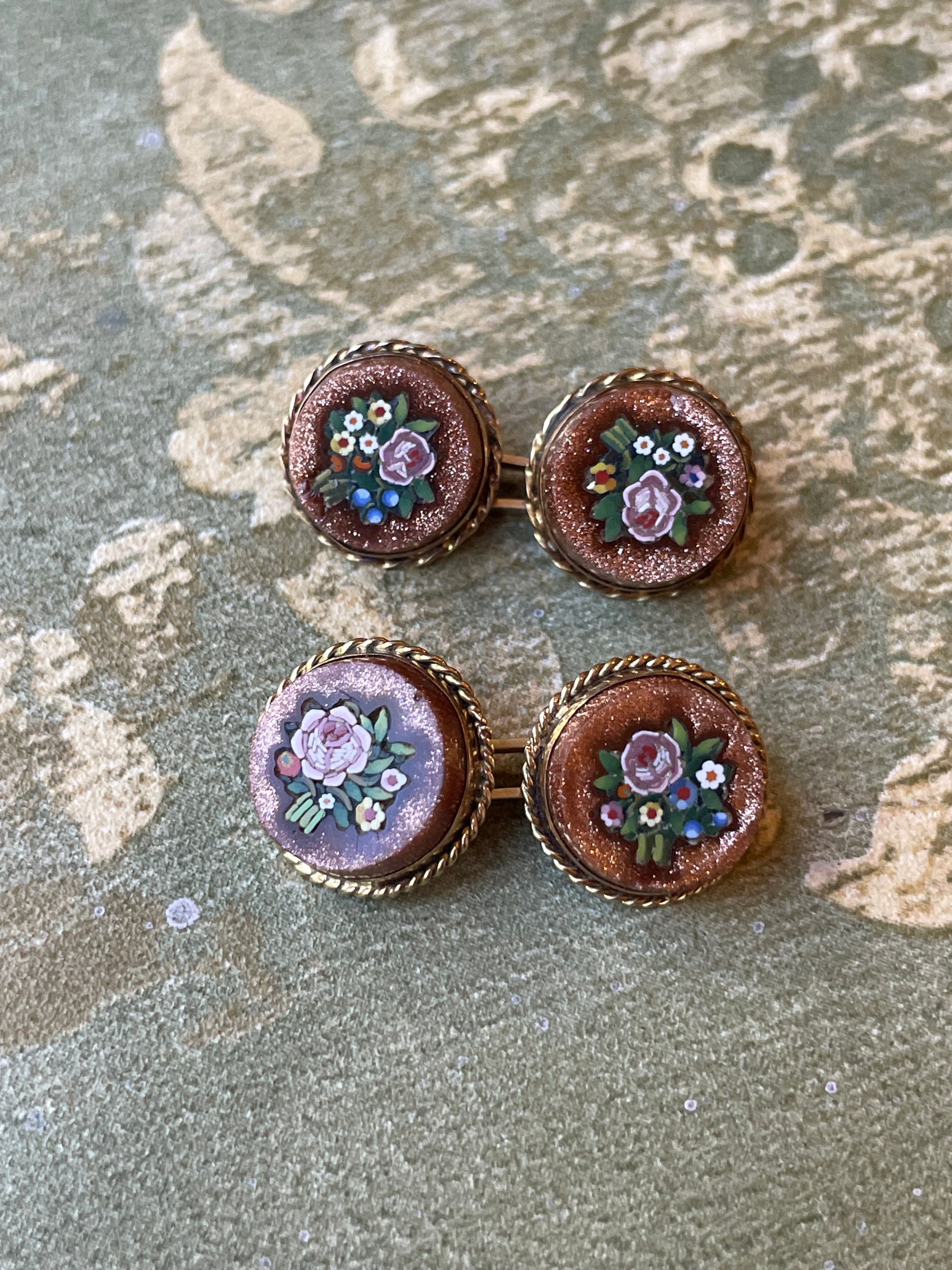 Eccezionali, raffinati, in perfetto stato di conservazione, questi gemelli doppi sono decorati con un piccolo, delizioso bouquet floreale in micromosaico su aventurina