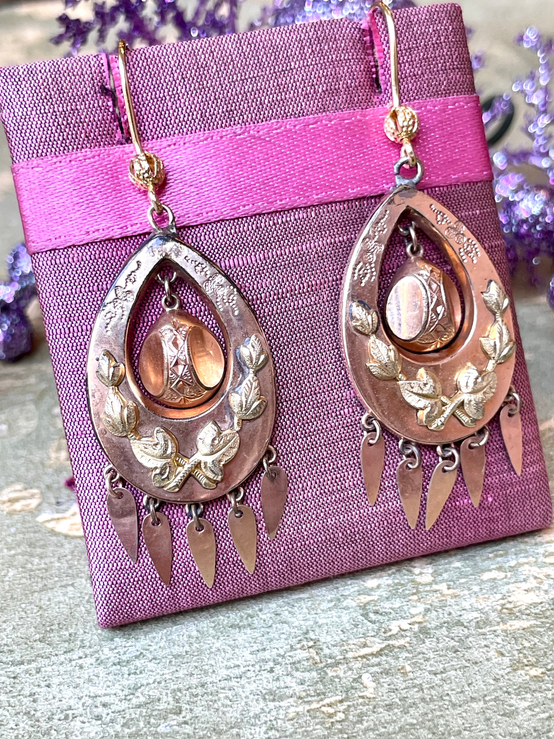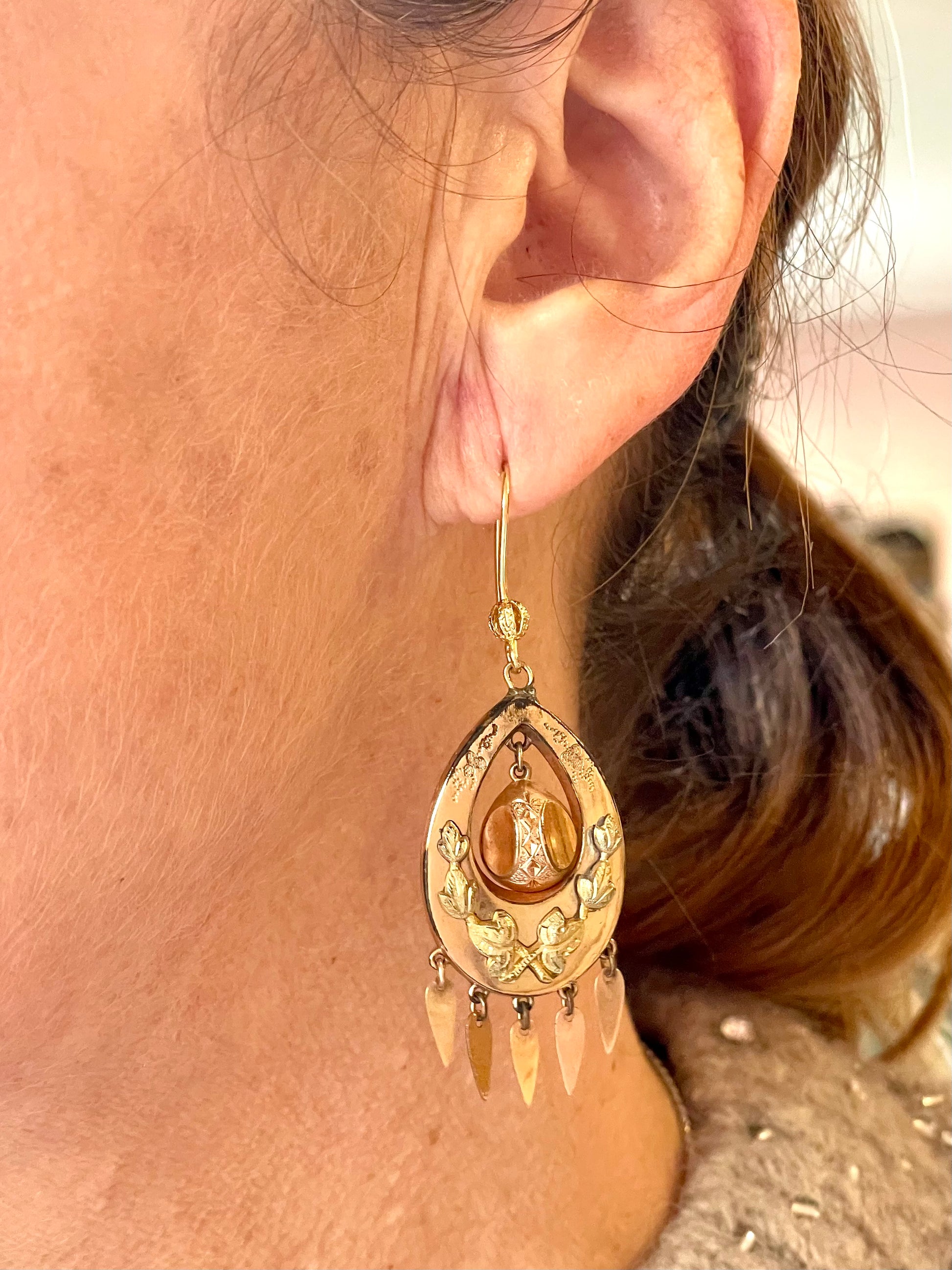 Questi stupendi orecchini sono caratterizzati da un modello veramente raffinato ed originale, quello a goccia; molto amato nel XIX secolo, questo modello è arricchito da piccoli pendenti come tante frange.