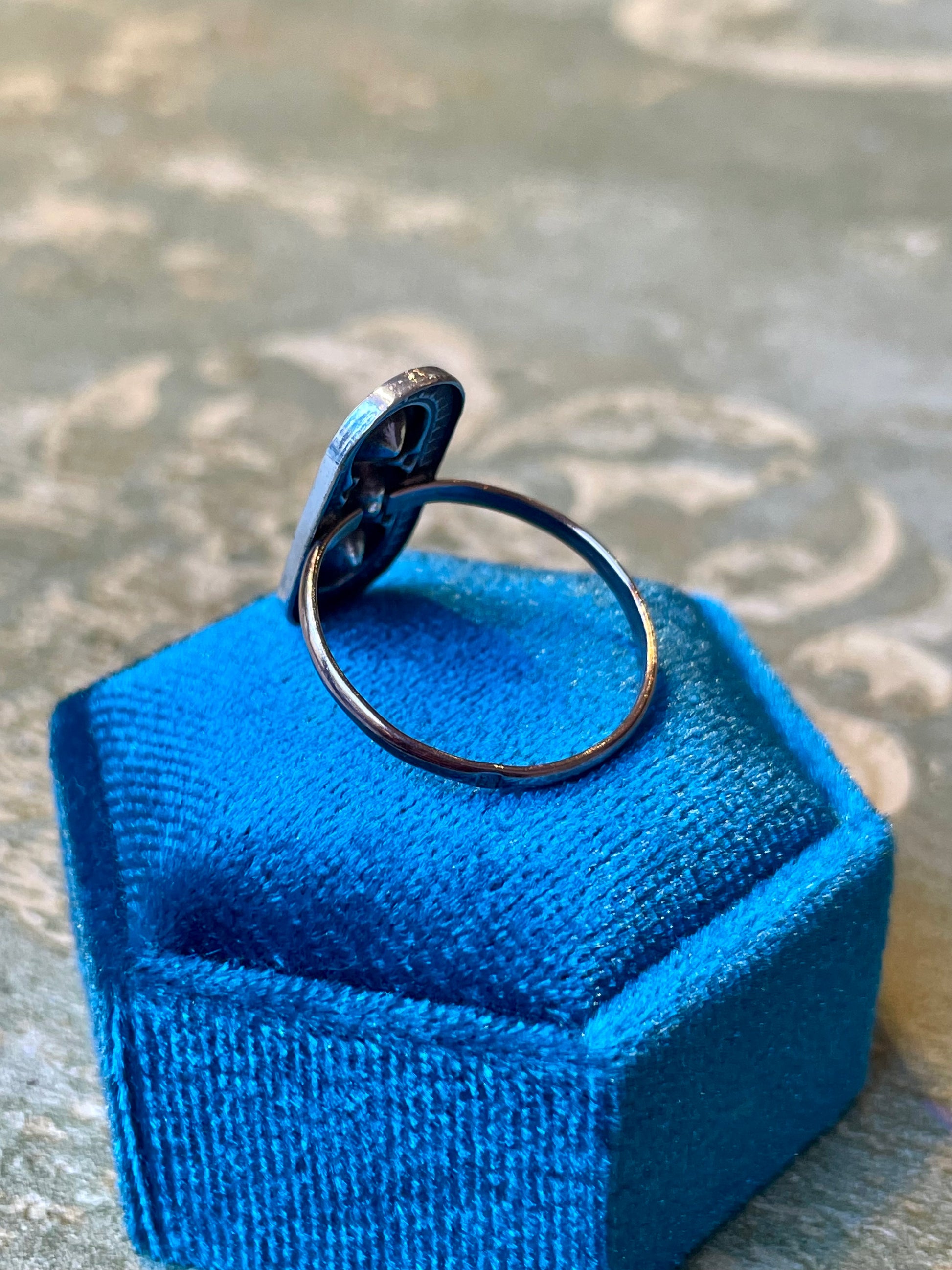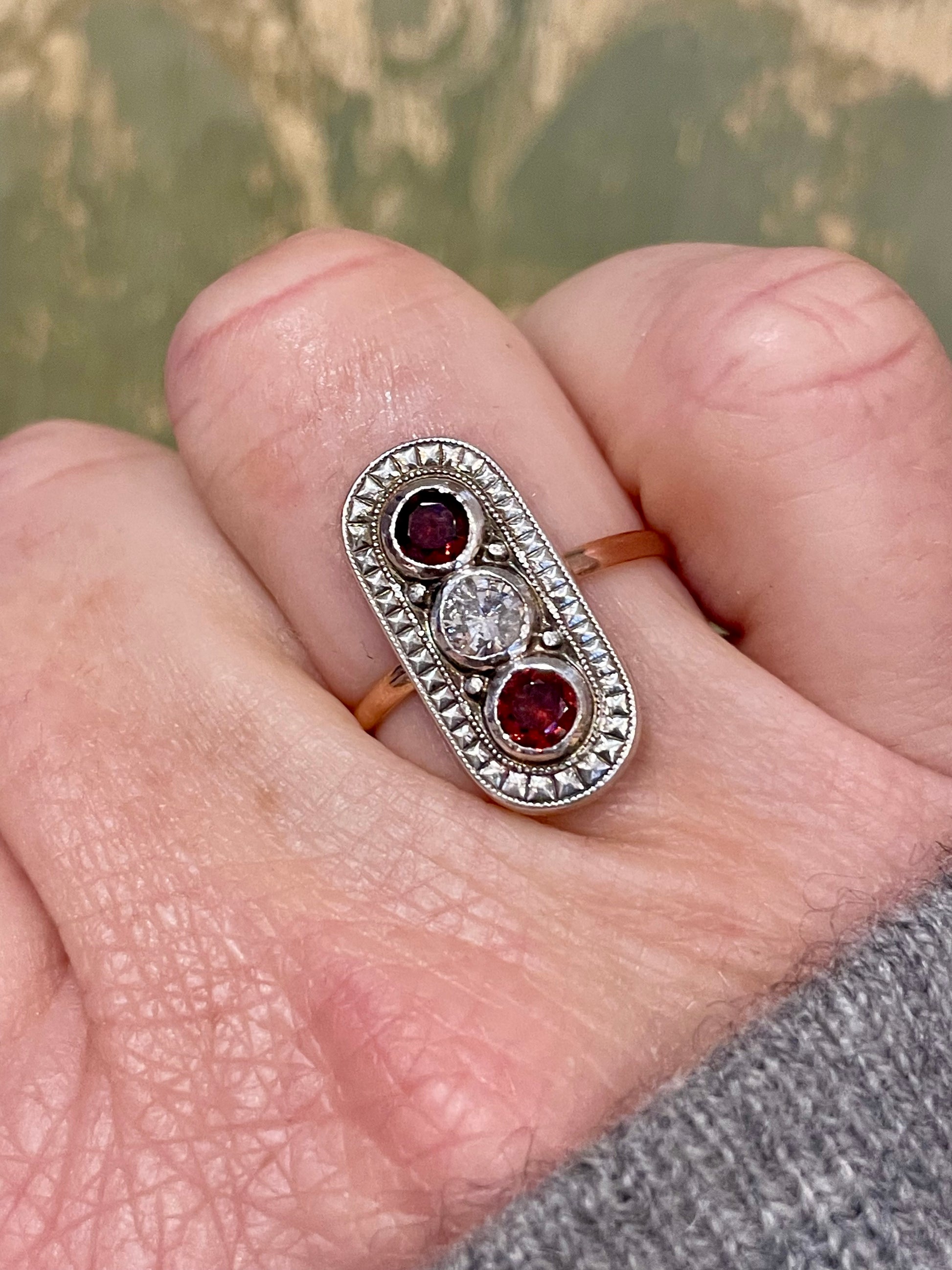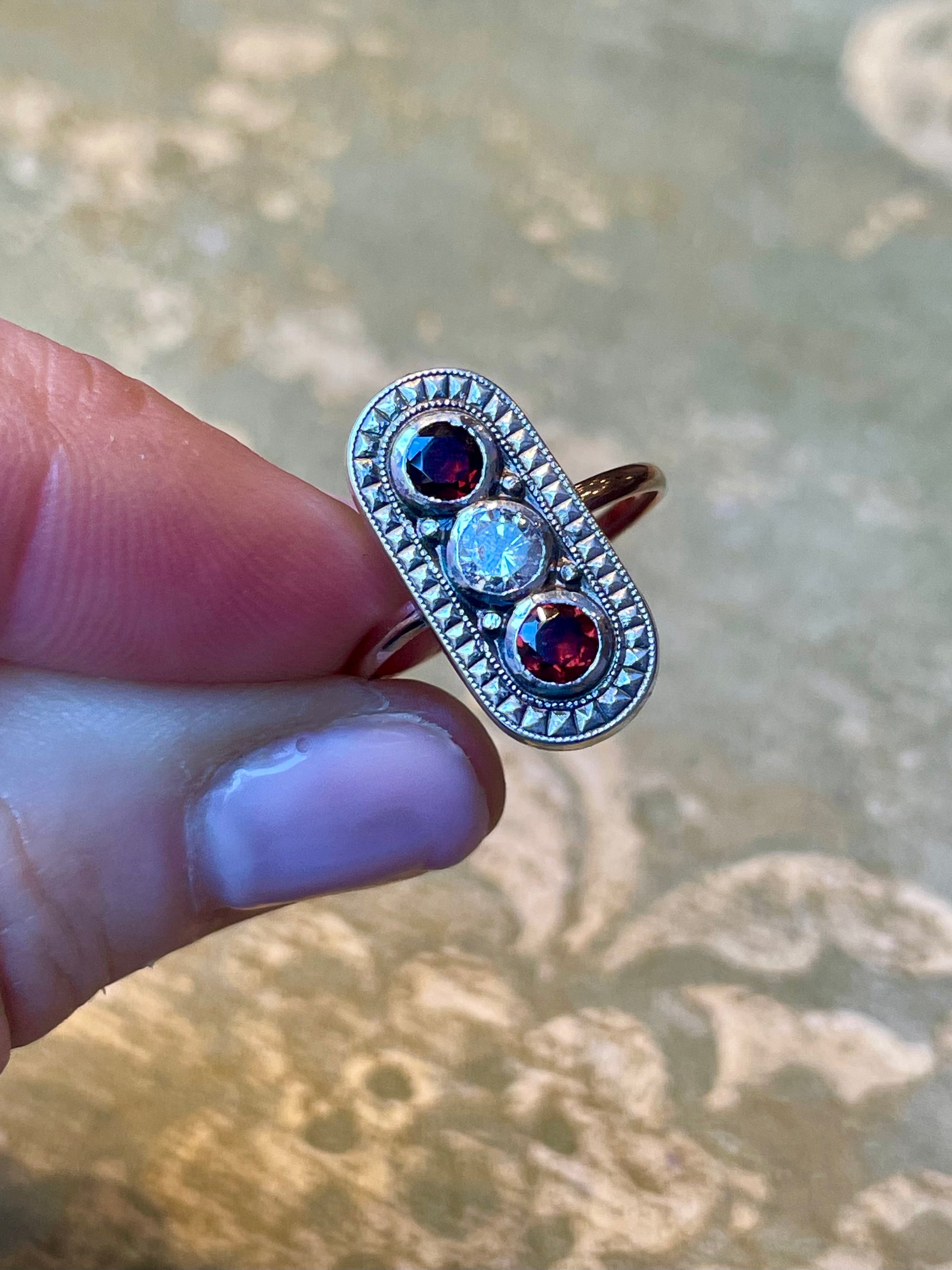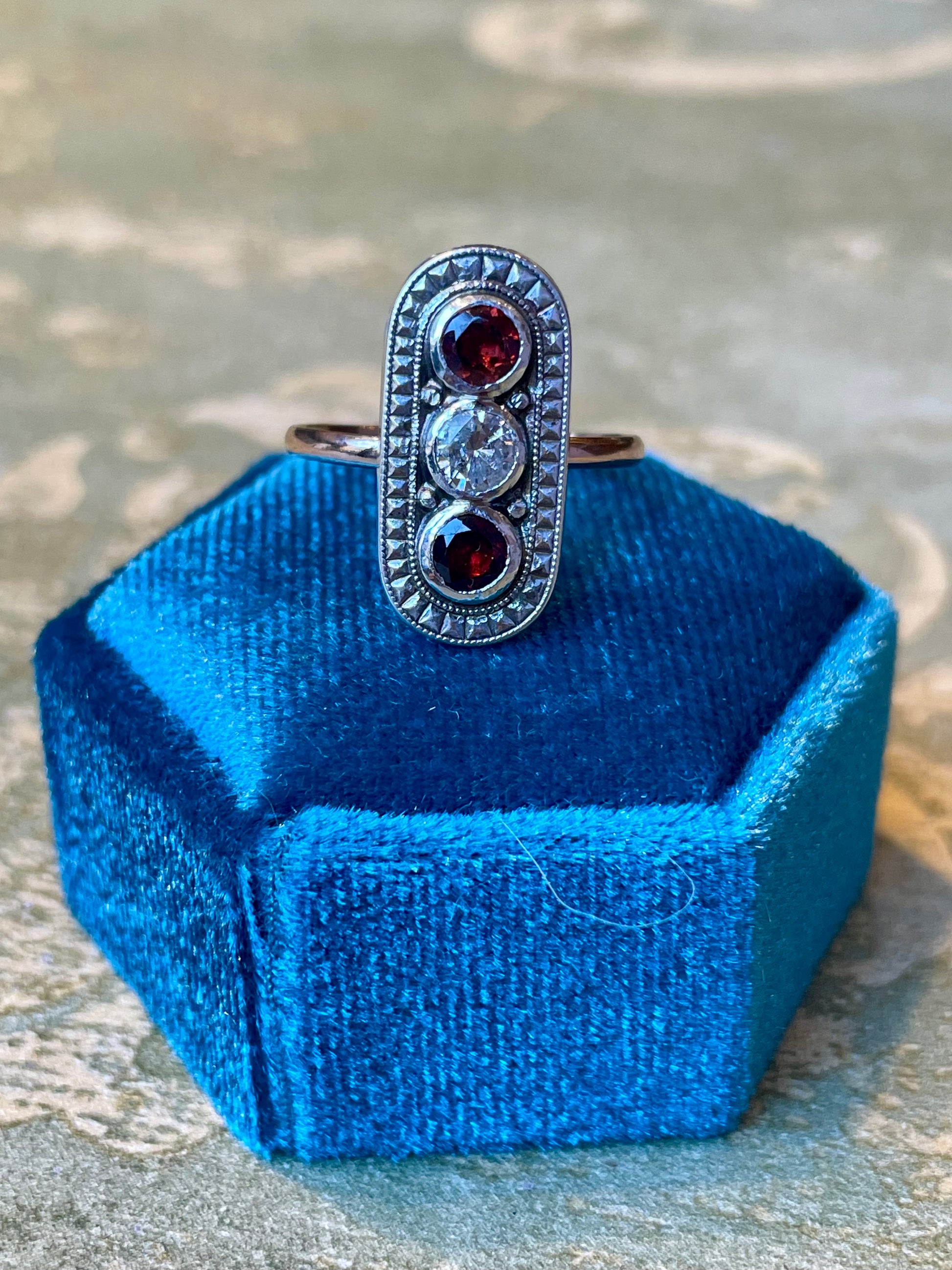 Raffinato ed elegante, questo anello presenta un modello a spoletta; è realizzato in argento e oro rosa; la parte centrale è caratterizzata da una cornice incisa a punta di diamante , impreziosita da un diamante taglio antico e da due granati.