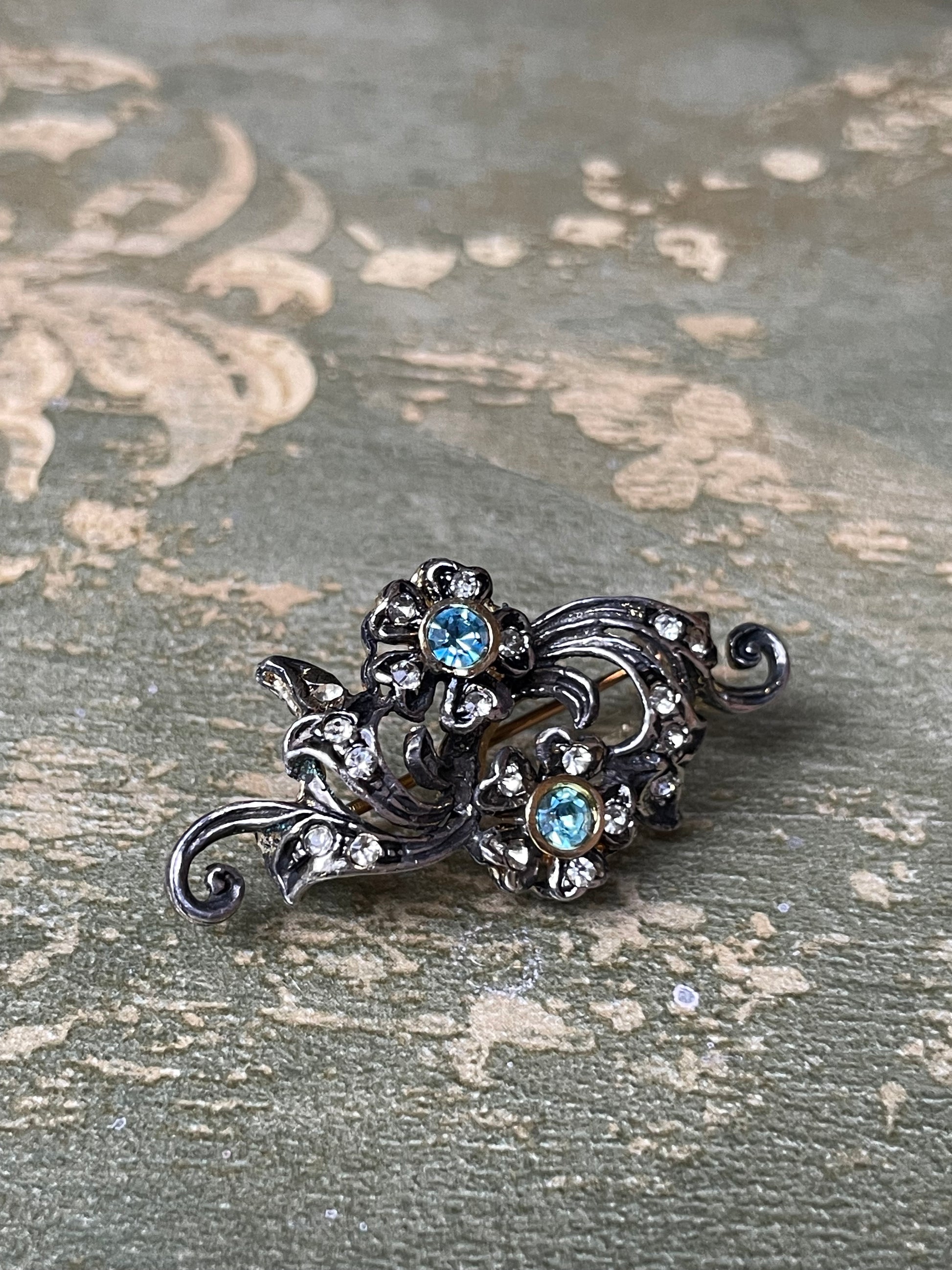 Un gioiello dall’animo romantico e ispirato, questa splendida spilla realizzata in argento e vermeil presenta un tralcio di fiori arricchiti da cristalli azzurri e bianchi