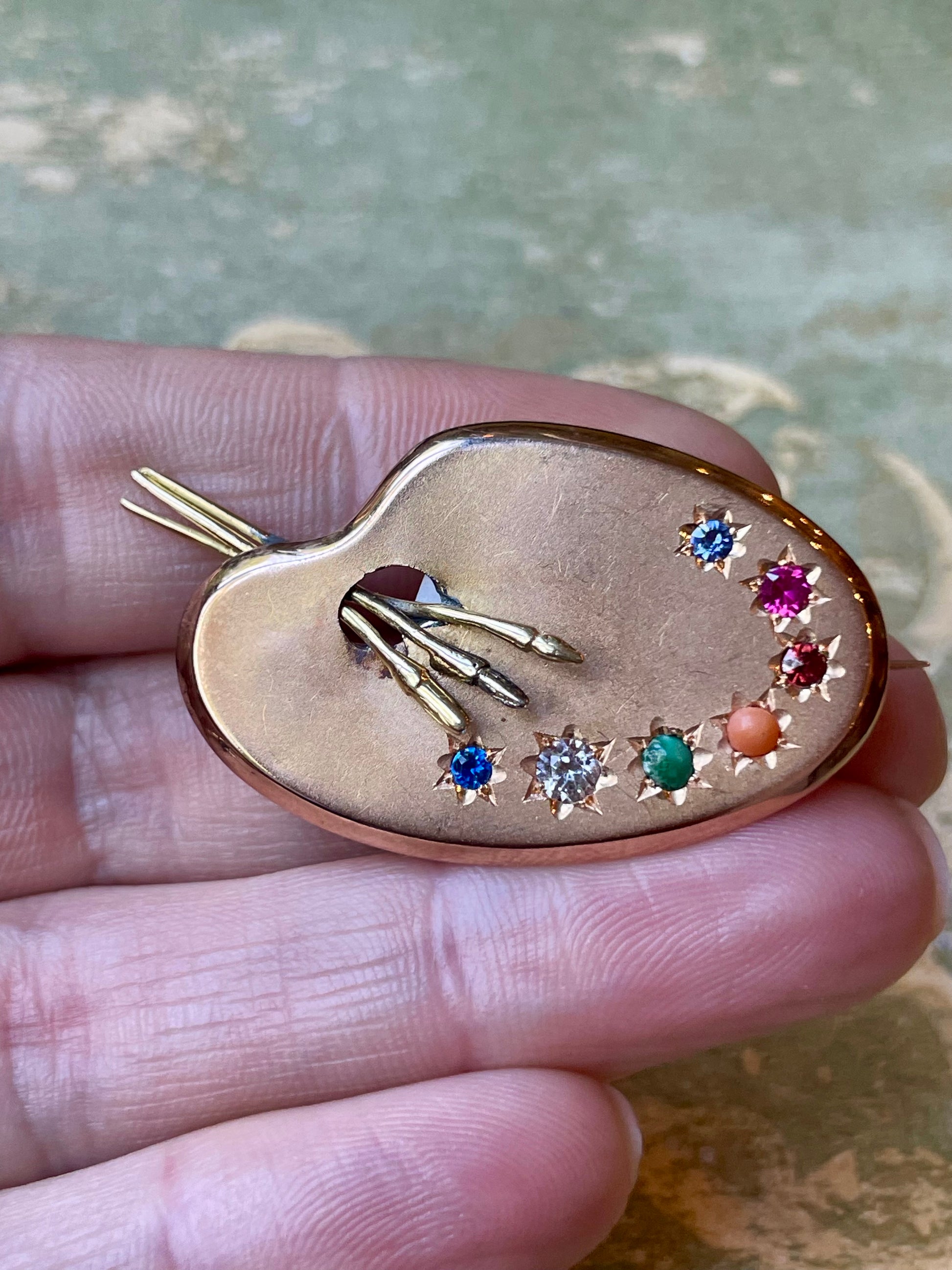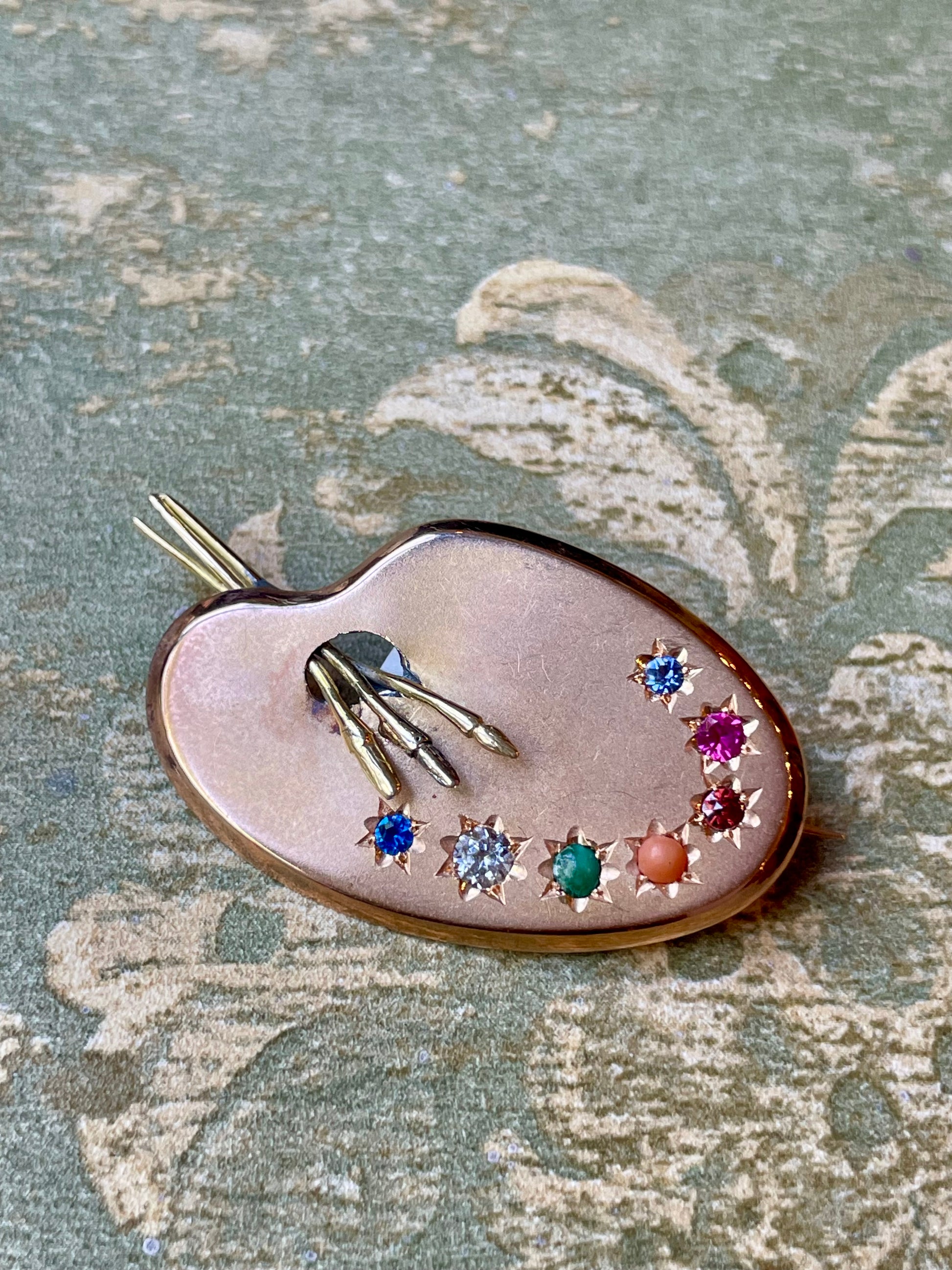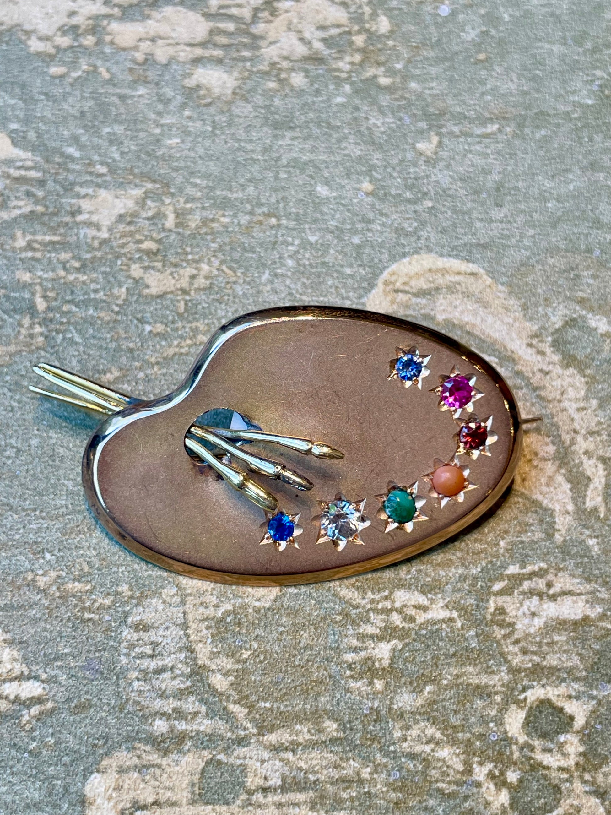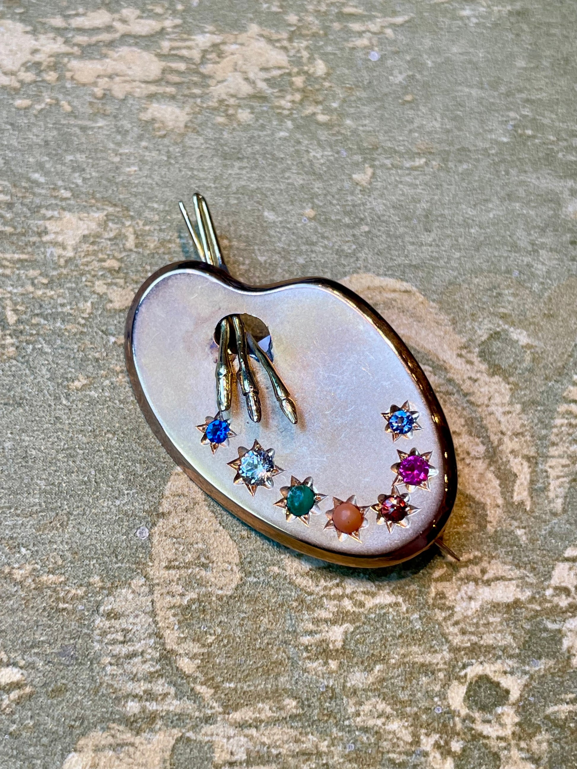 Un gioiello così originale e’ davvero raro e pressoché introvabile! Una raffinata spilla a forma di tavolozza del pittore, in cui i colori sono tante piccole pietre preziose incastonate a stella; da notare anche il dettaglio dei pennelli tridimensionali che escono fuori dalla tavolozza.