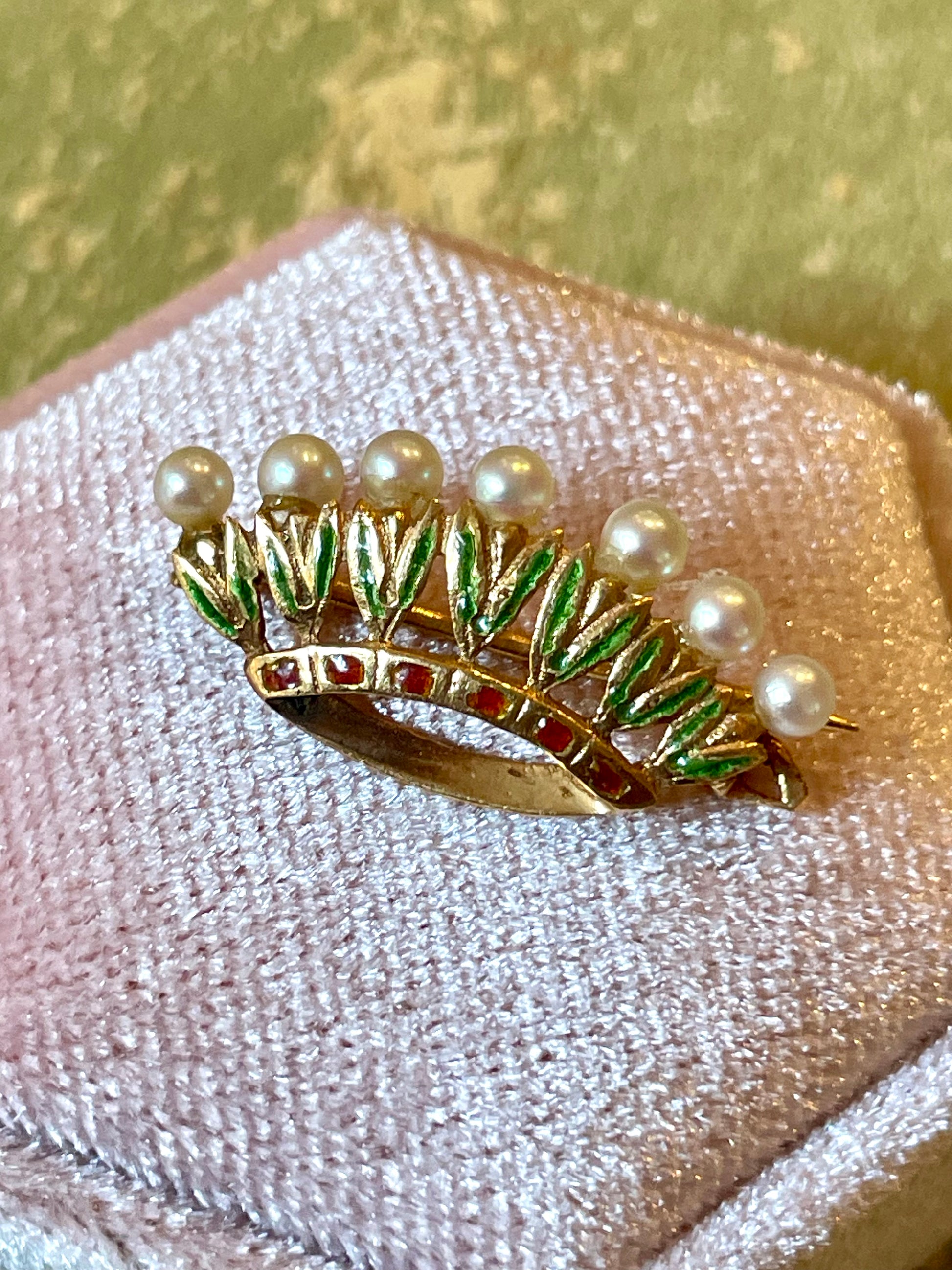 Un piccolo capolavoro, questa spilla a forma di corona e’ realizzata in oro giallo e arricchita da una preziosa decorazione minuta in smalto sui toni del verde tenue.