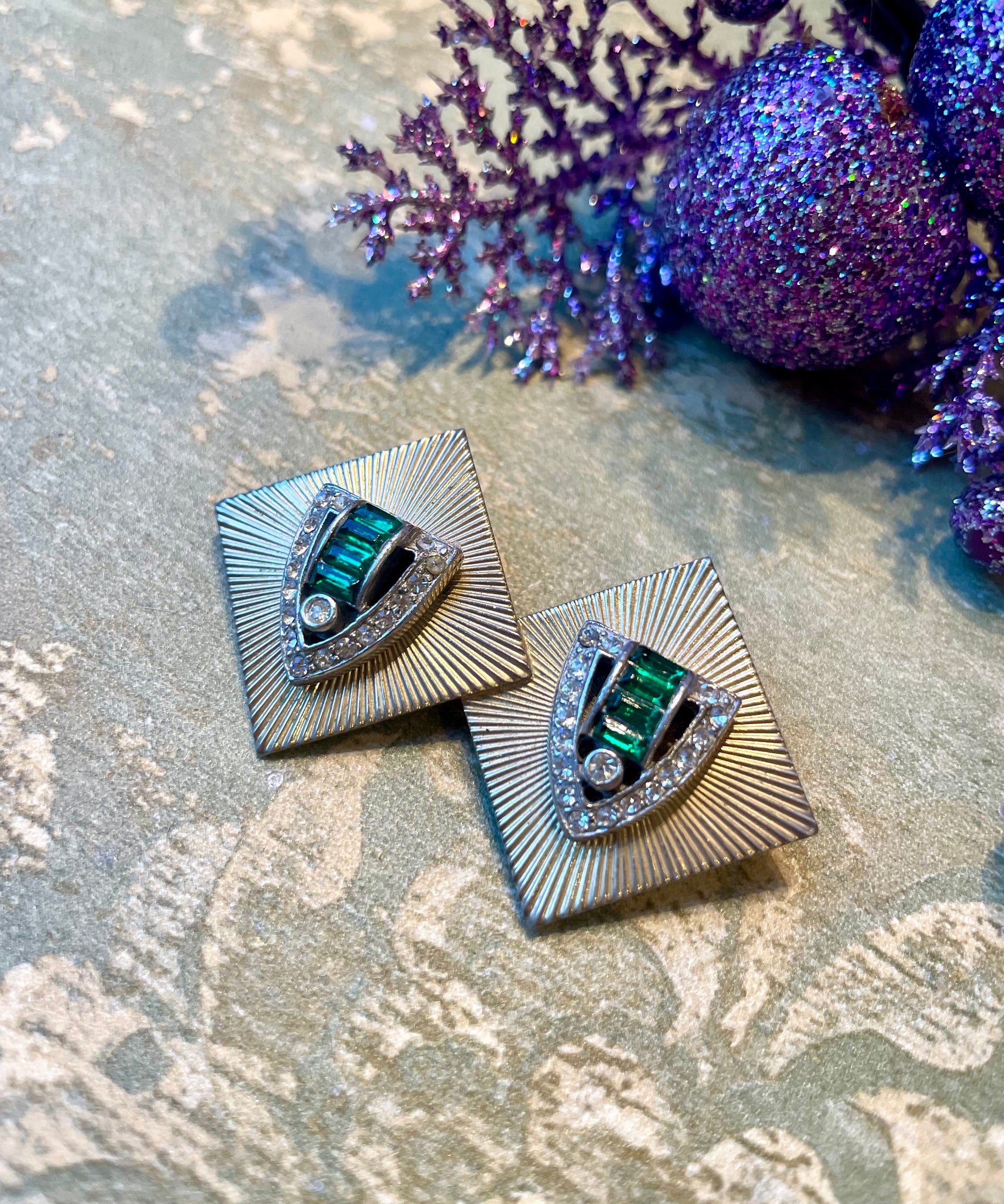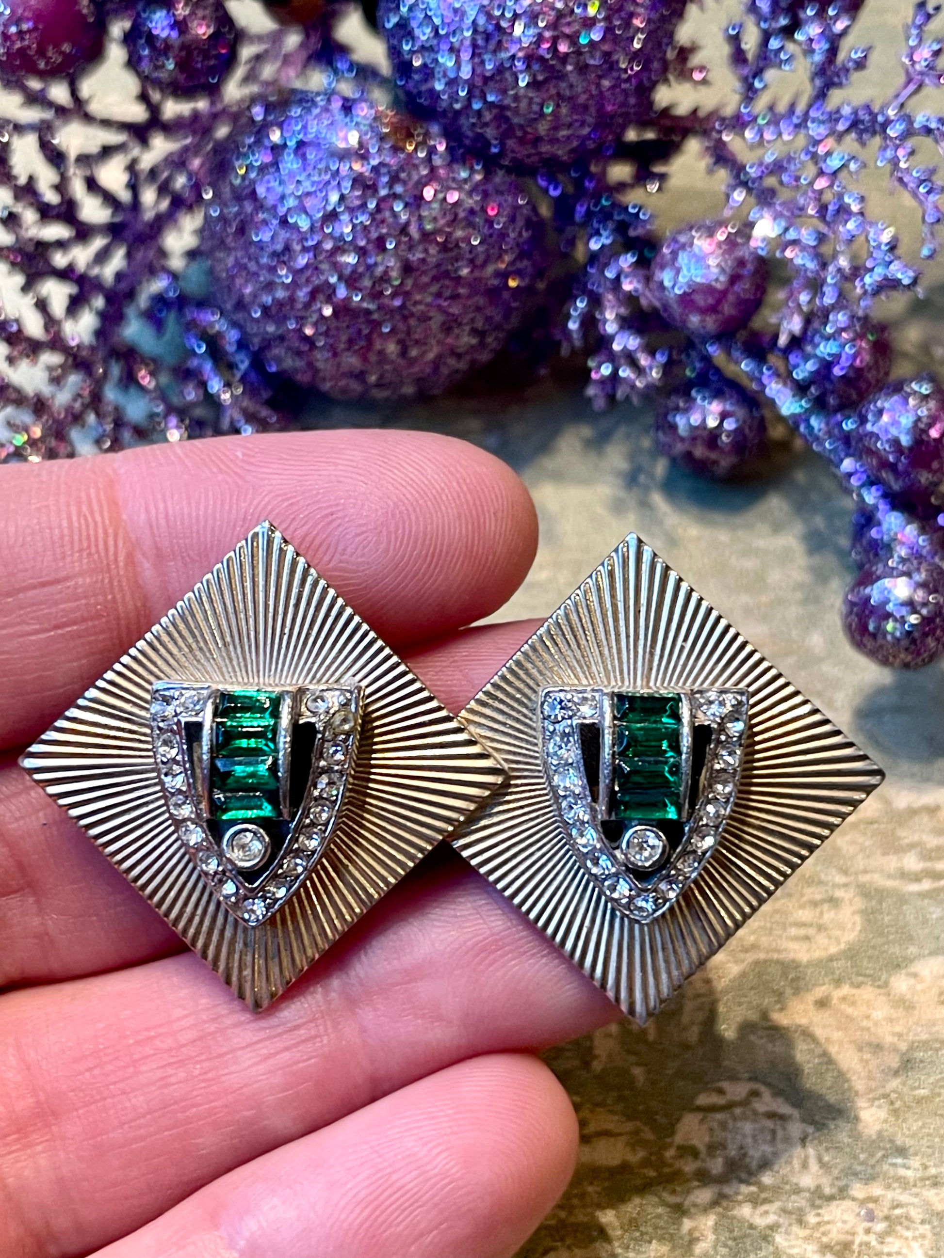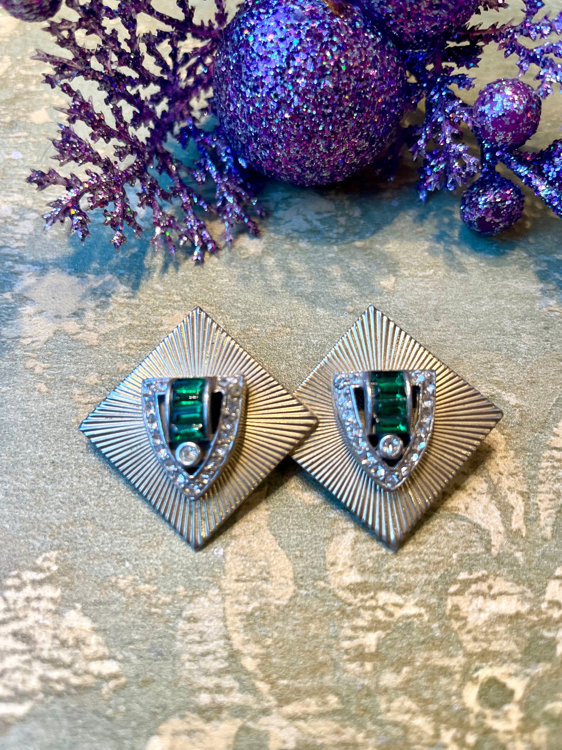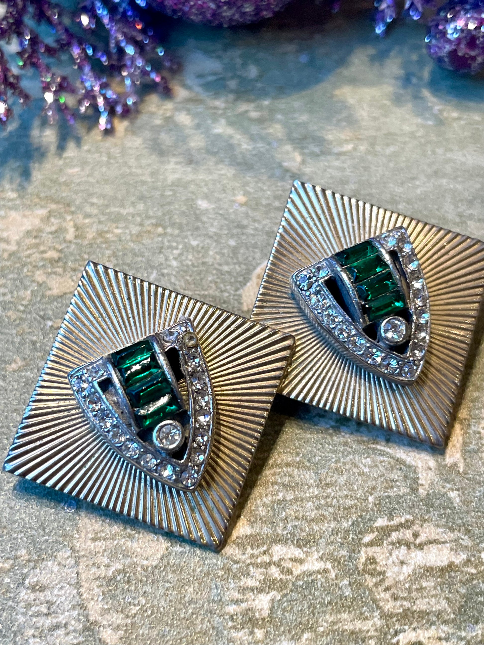 Una spilla sofisticata ed elegante, un doppio rombo in trifanium satinato, inciso a raggiera, decorato con due clip in strass bianchi e verdi.
