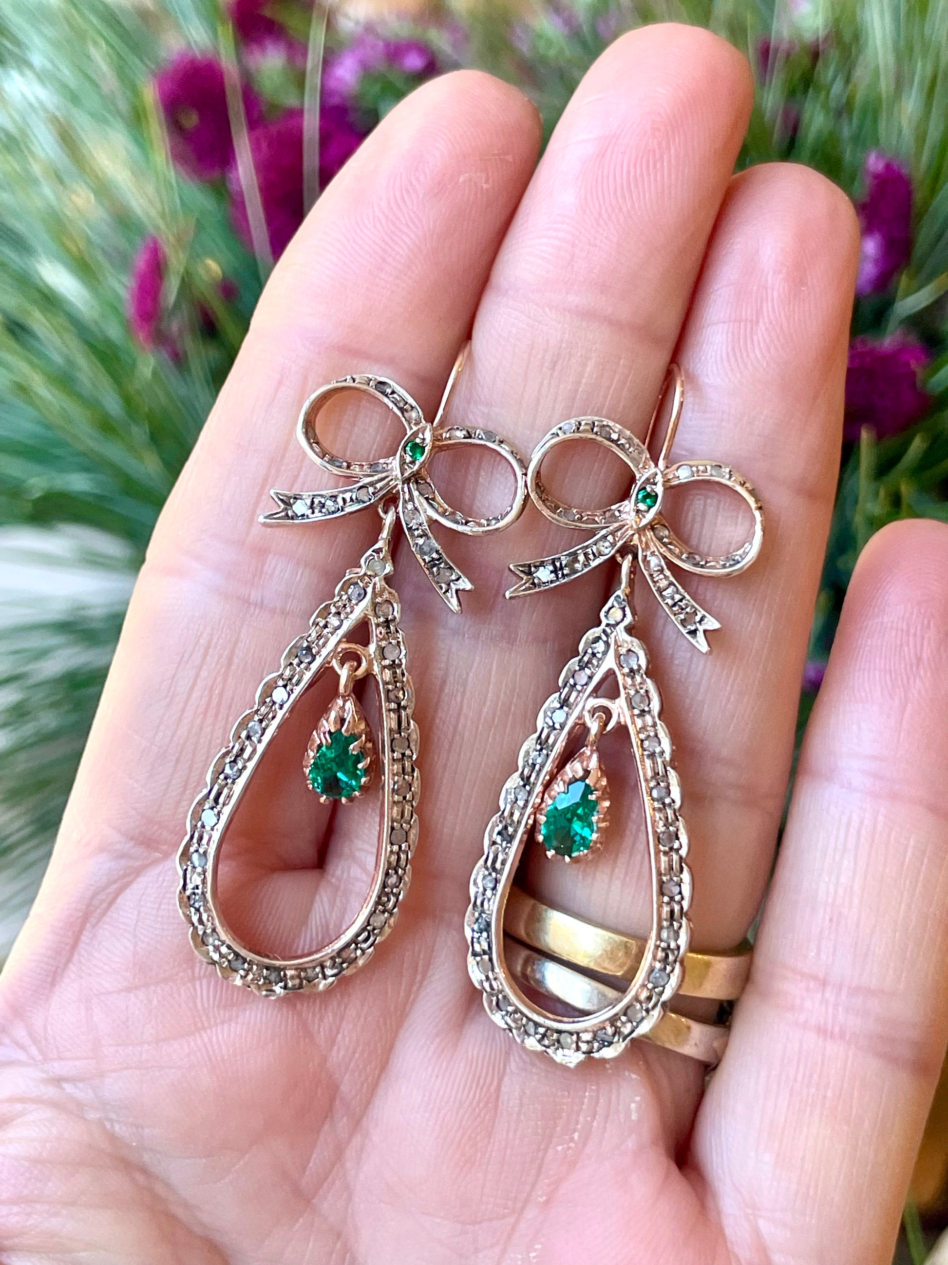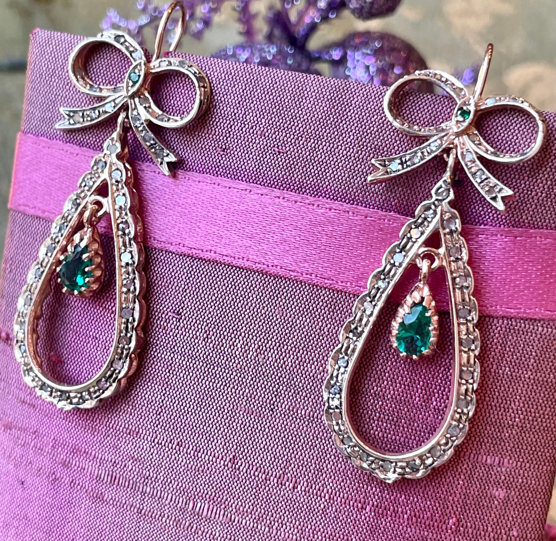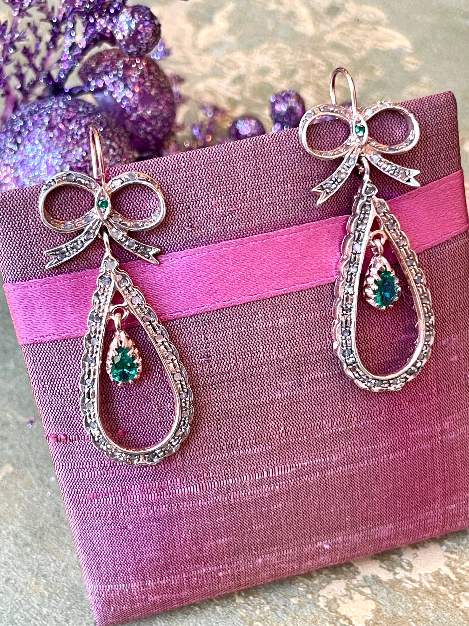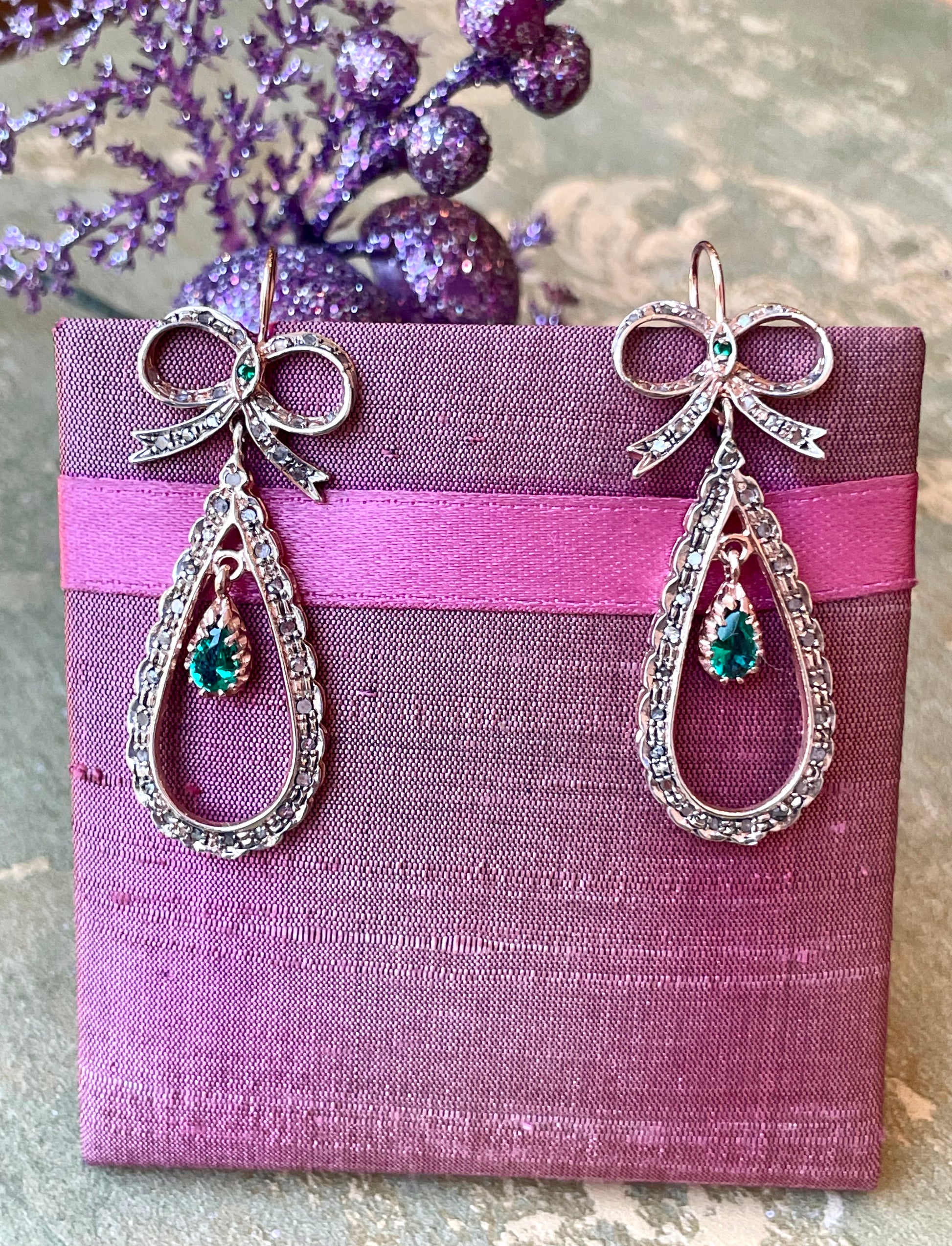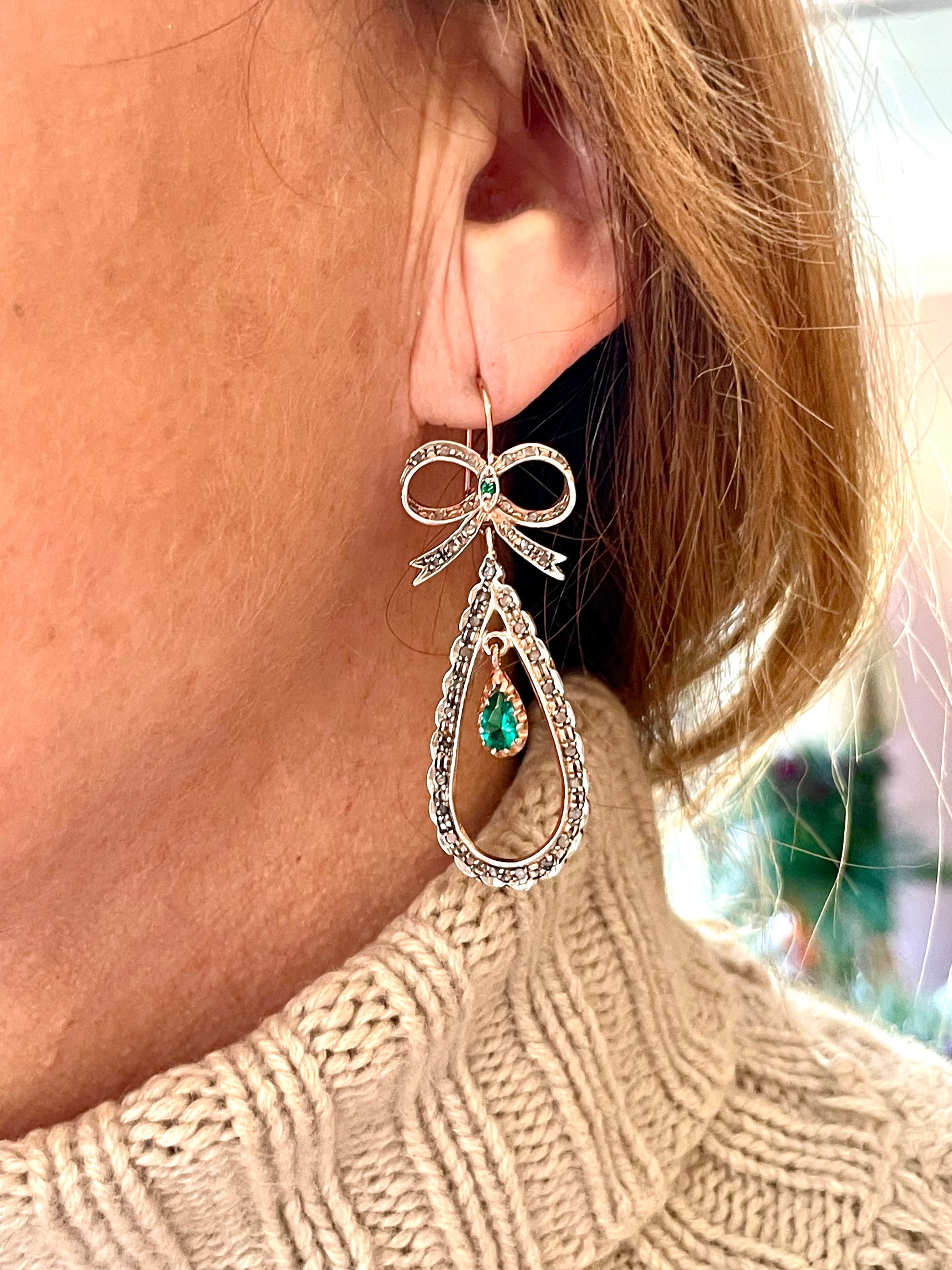 Realizzati in oro rosa e argento, presentano un attaccatura a fiocco da cui scende una goccia impreziosita da una tormalina verde.
