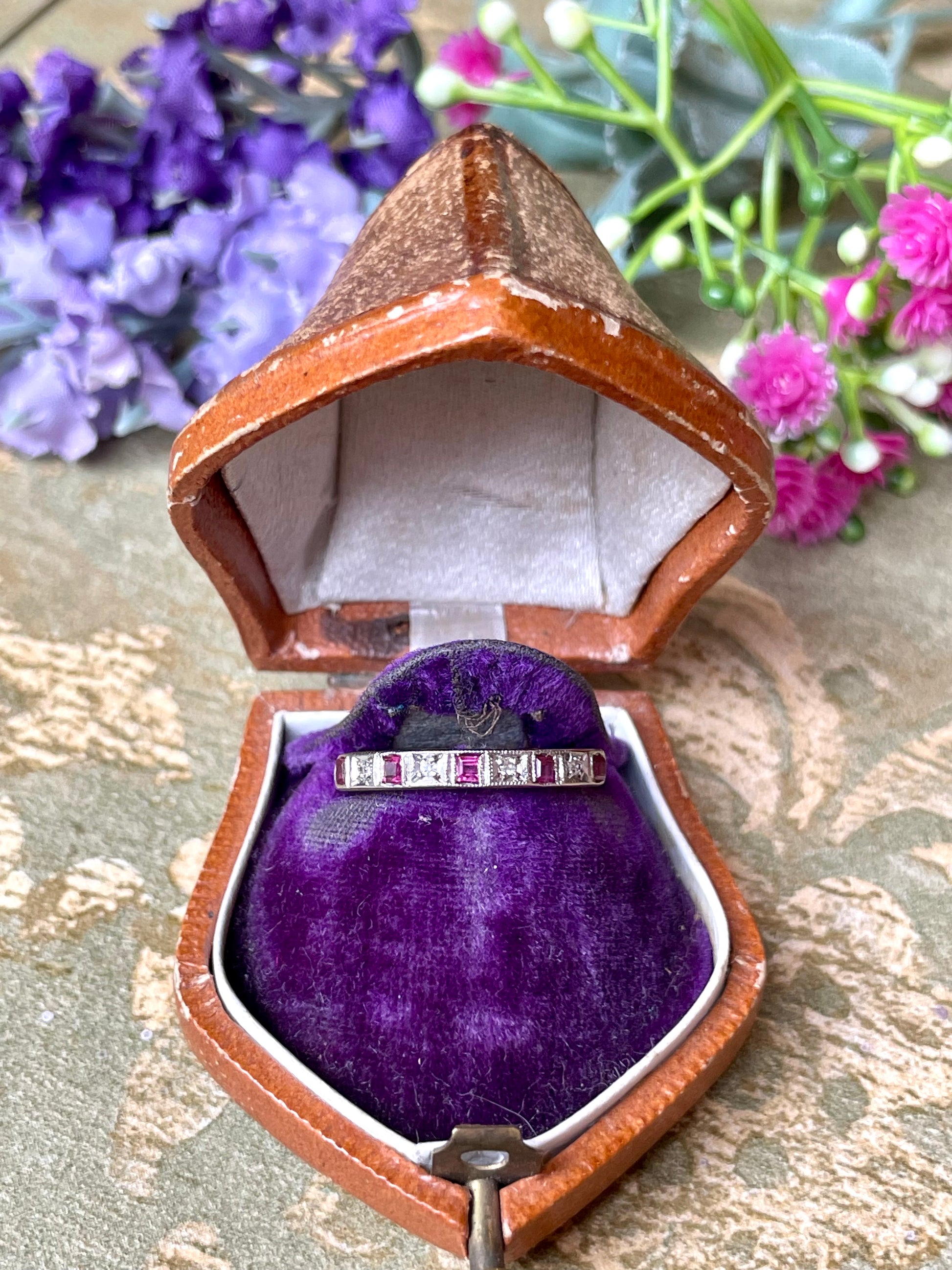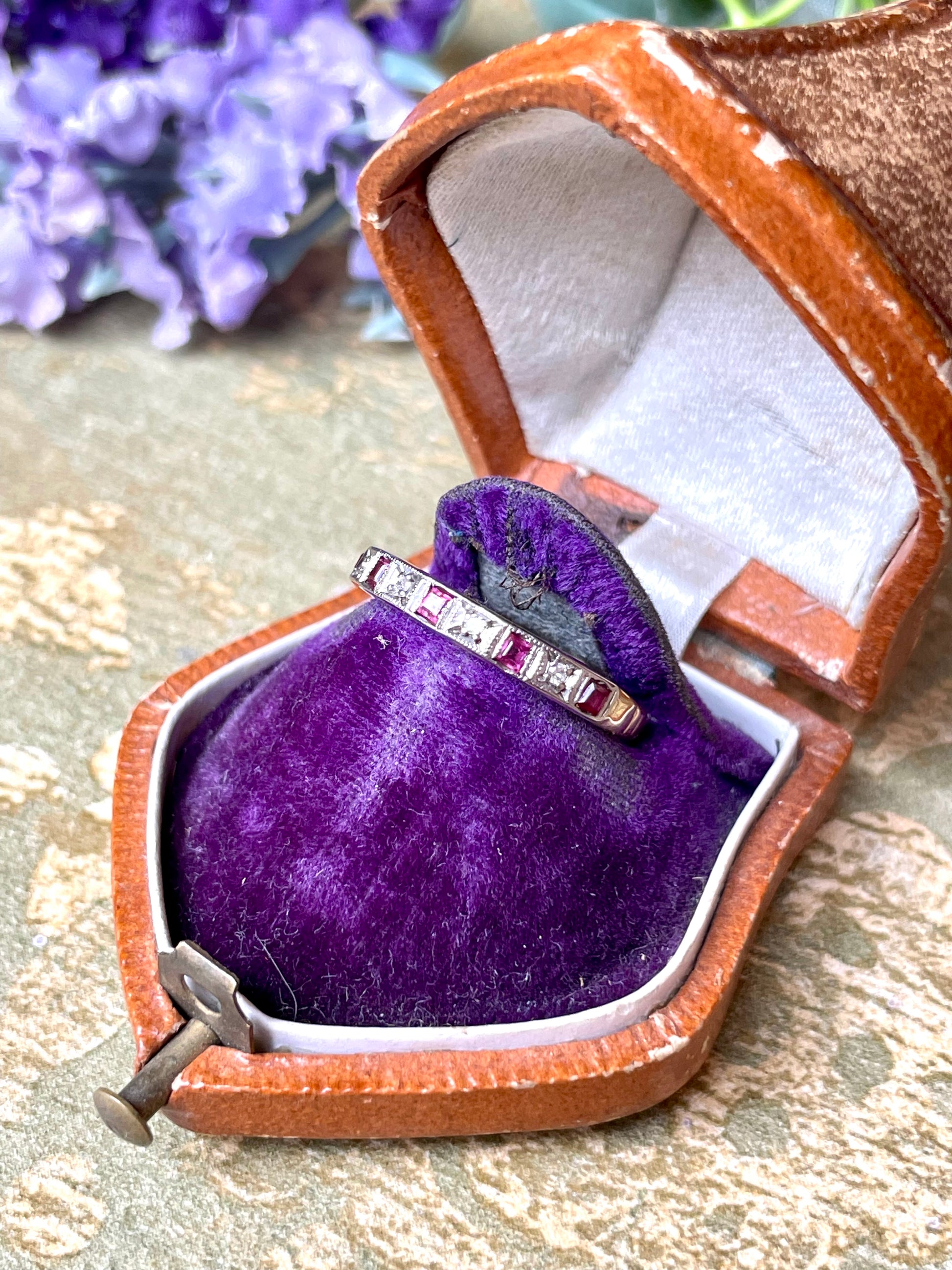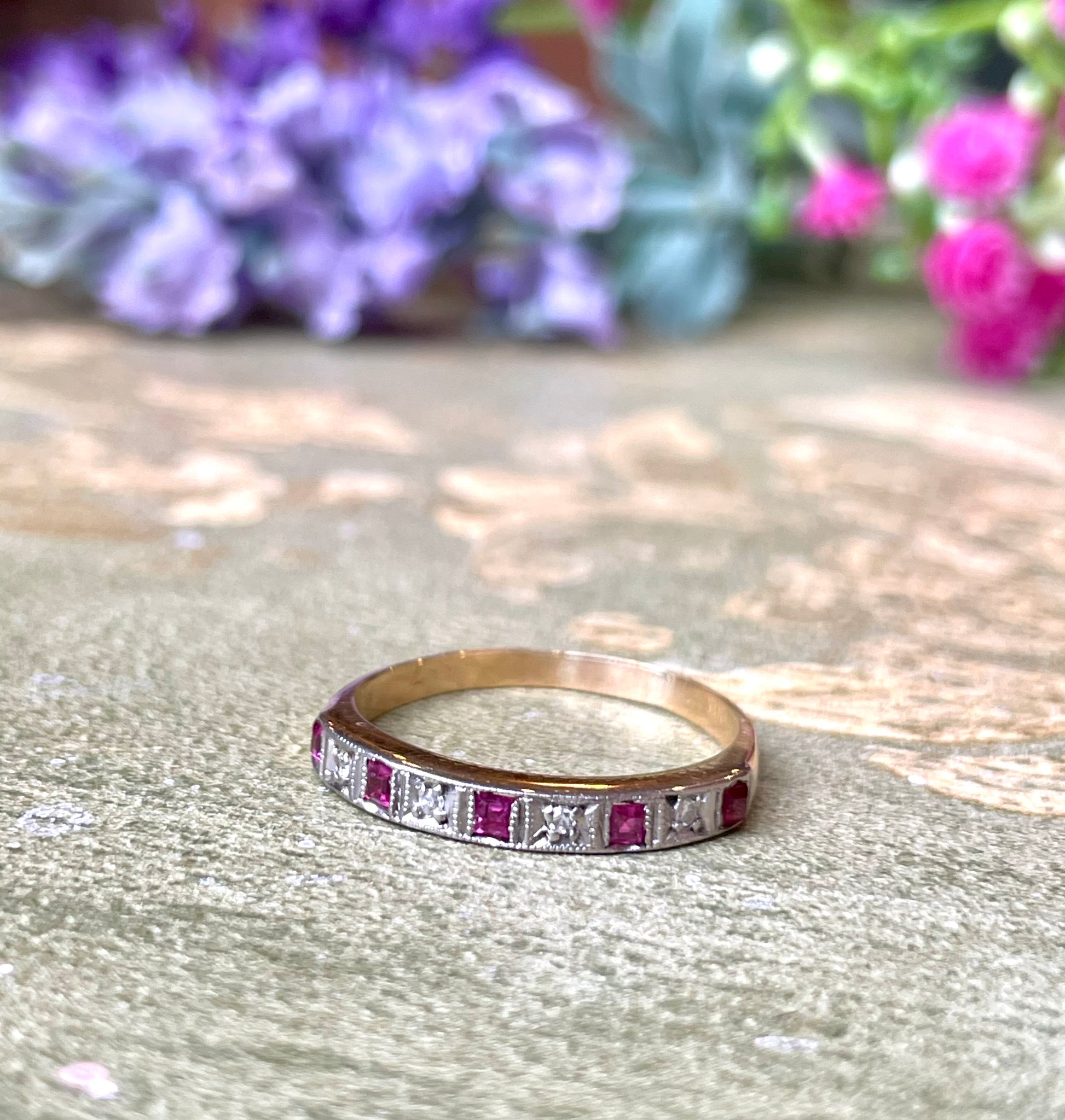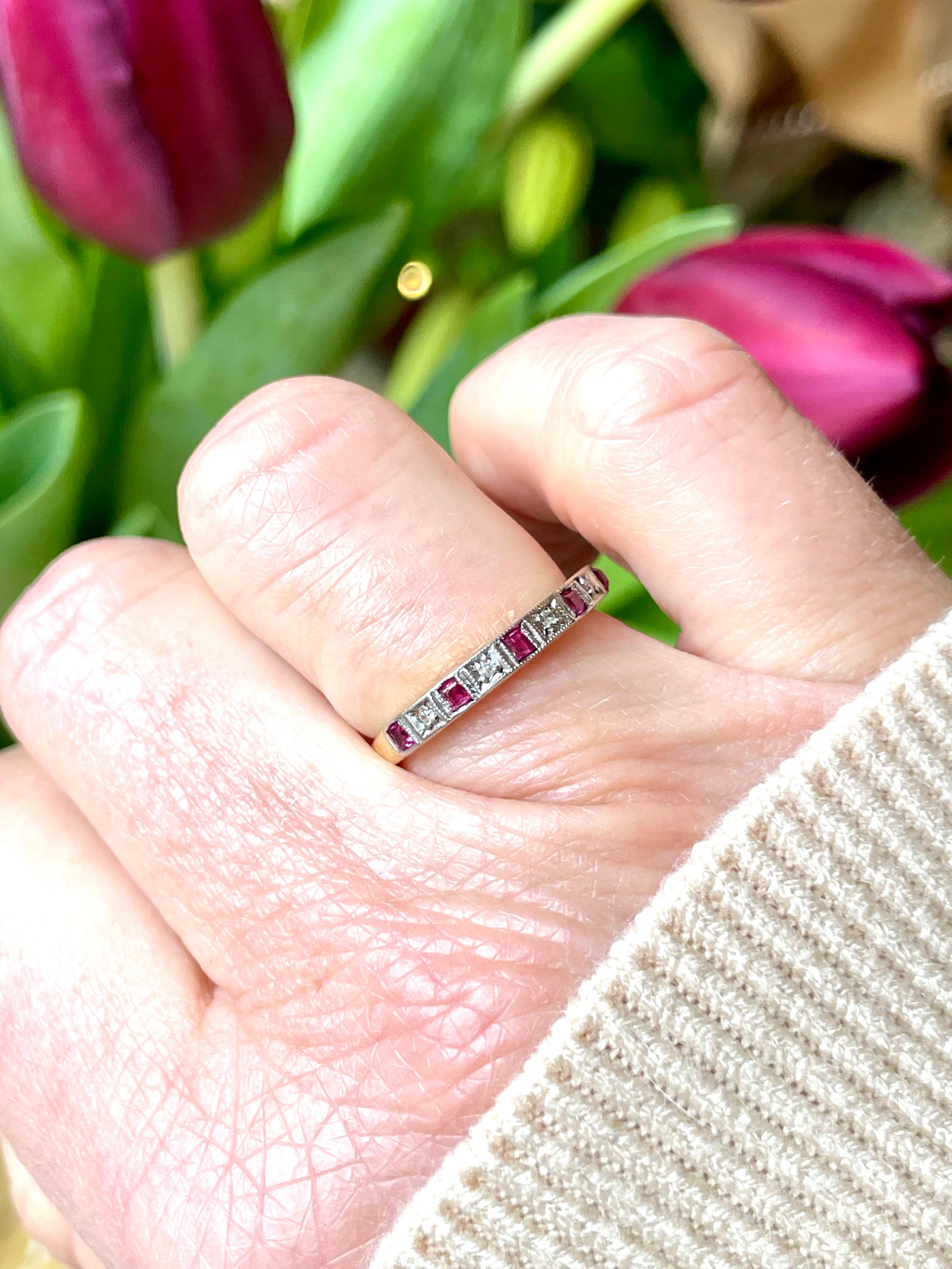 Un anello perfetto per la tua dichiarazione, la promessa di matrimonio o di fidanzamento. Una fede di fattura raffinata e rara qualità, montata in oro giallo e resa preziosa dall’alternarsi di rubini e diamanti, dalla luce intensa e vibrante.