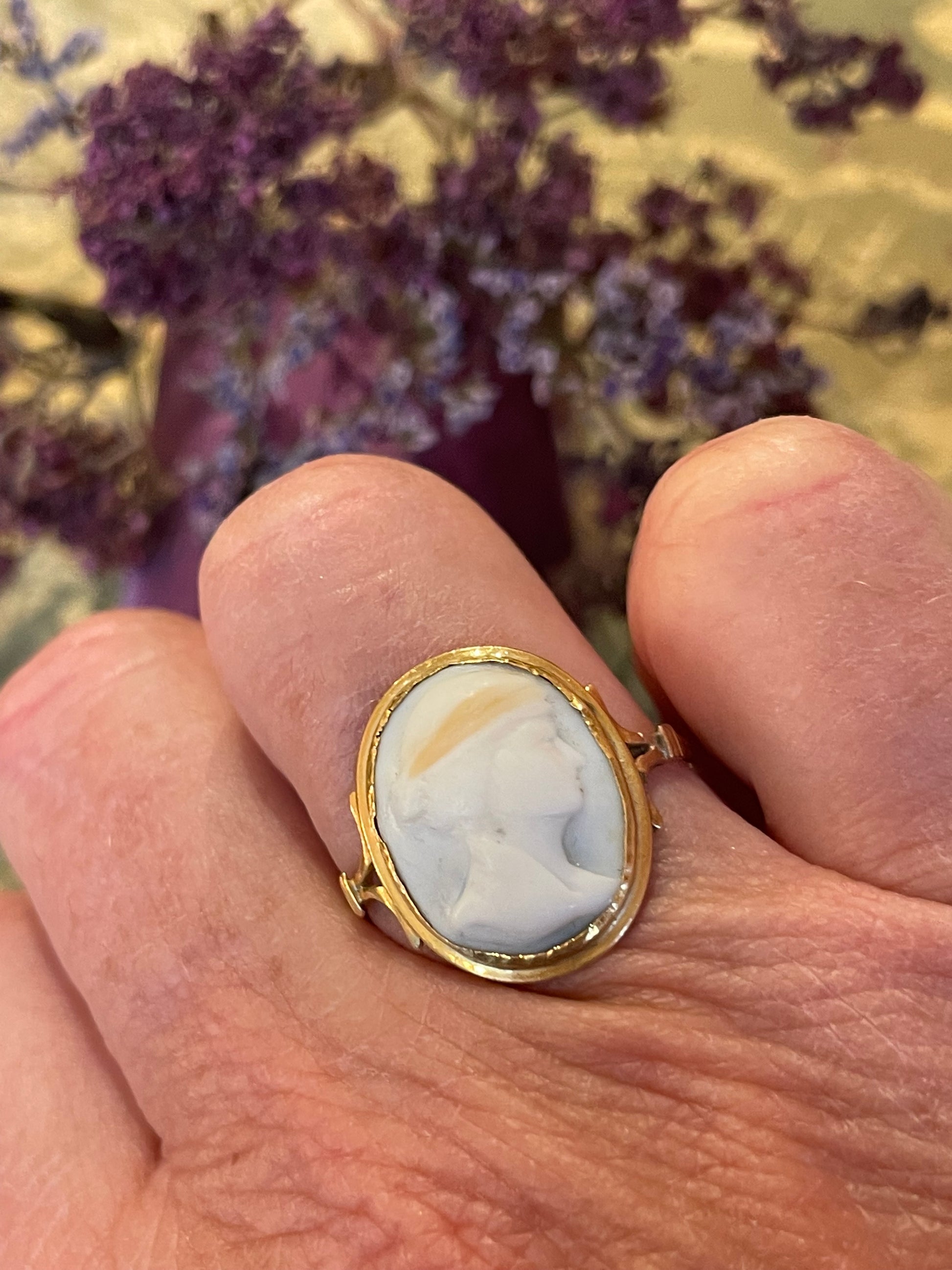 Squisito anello con cammeo neoclassico in agata bianca, epoca vittoriana