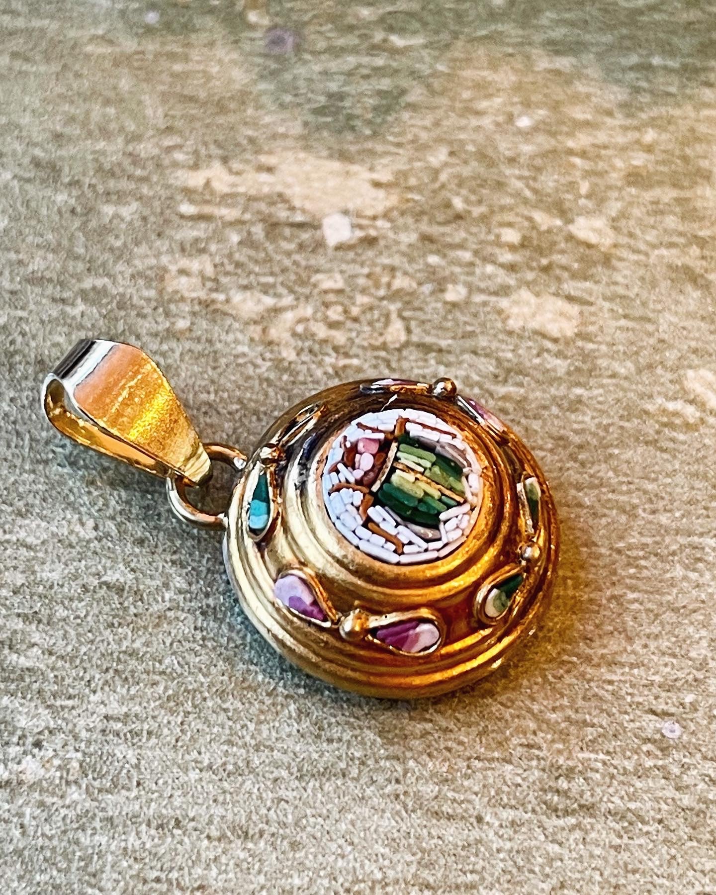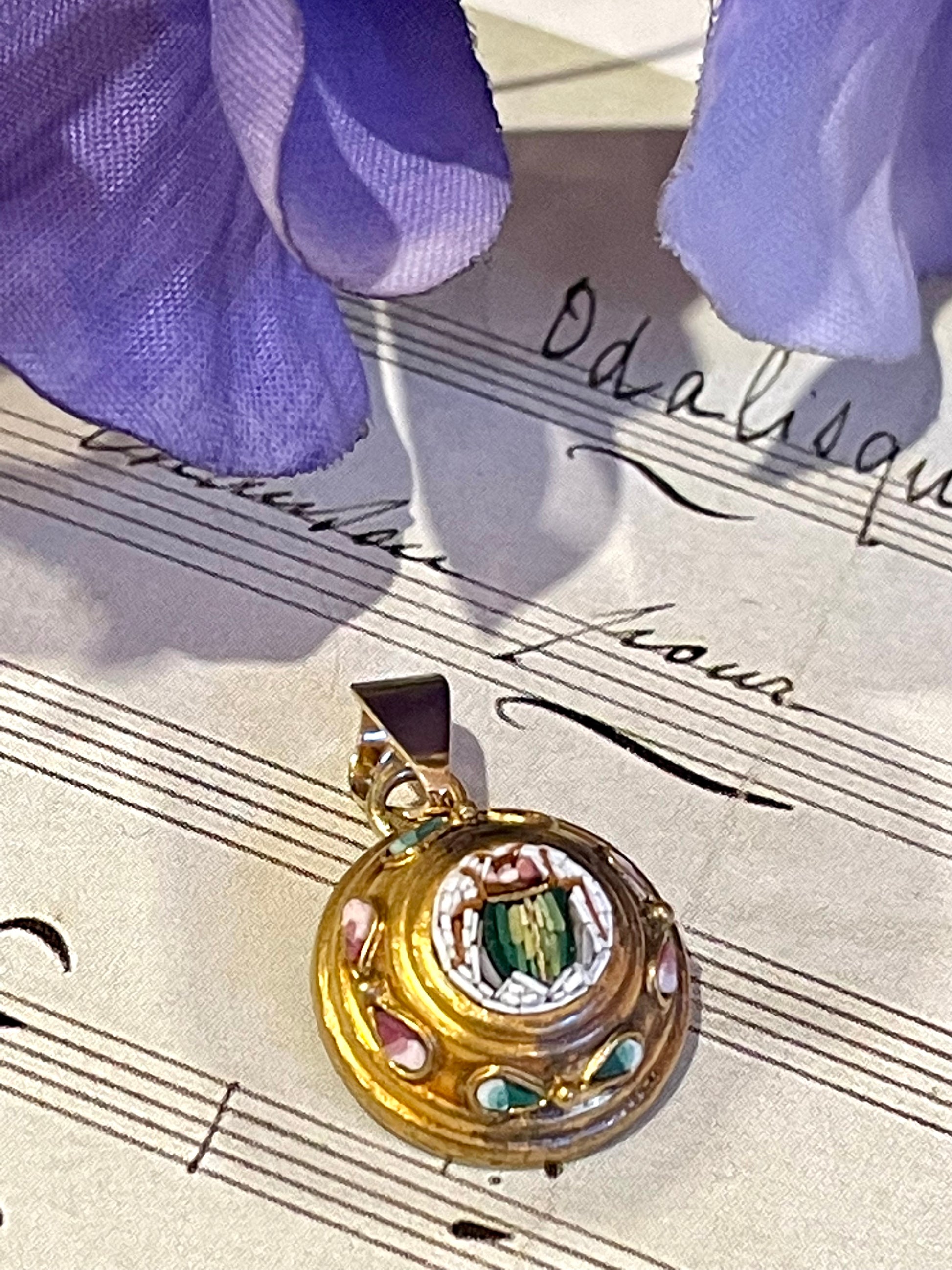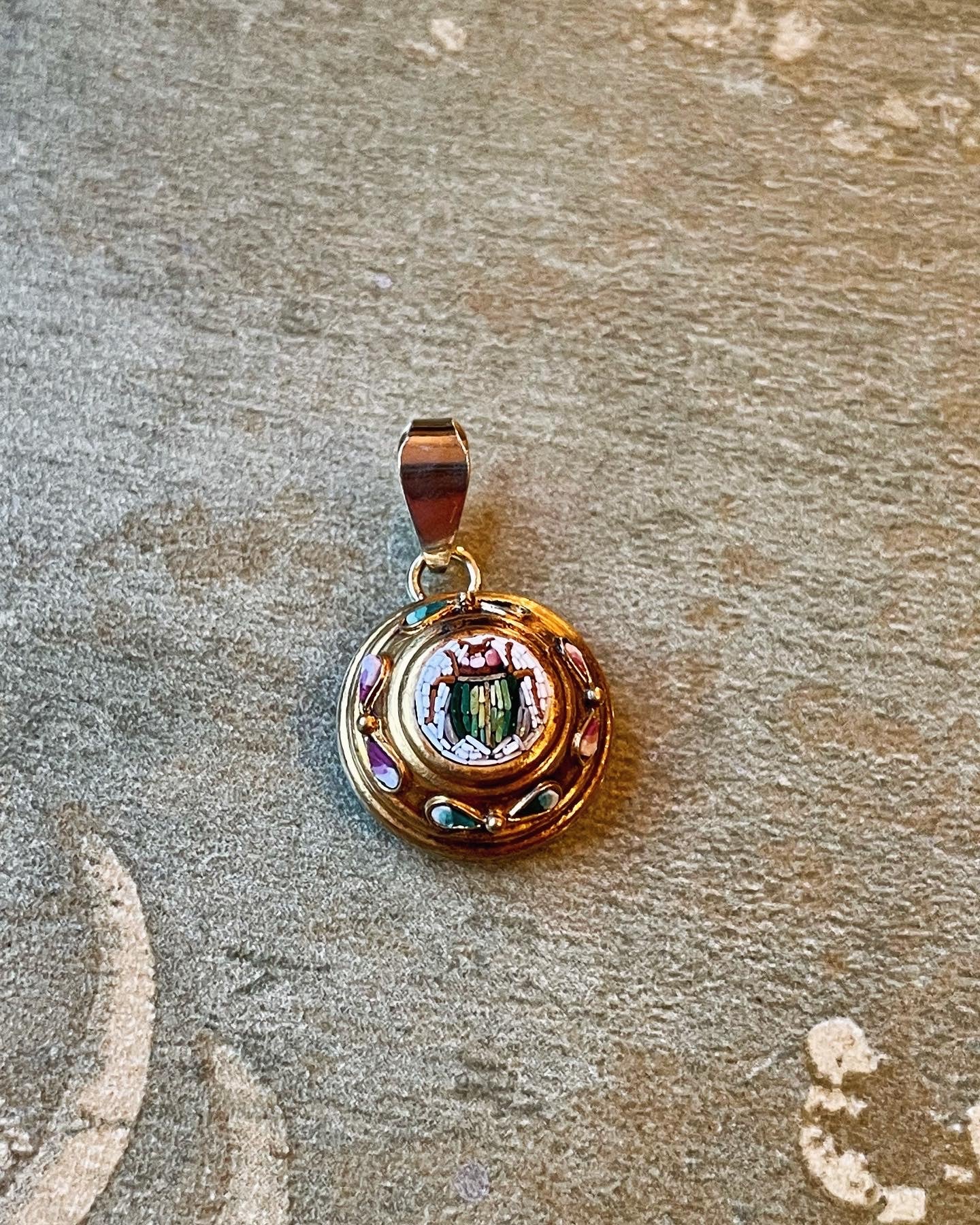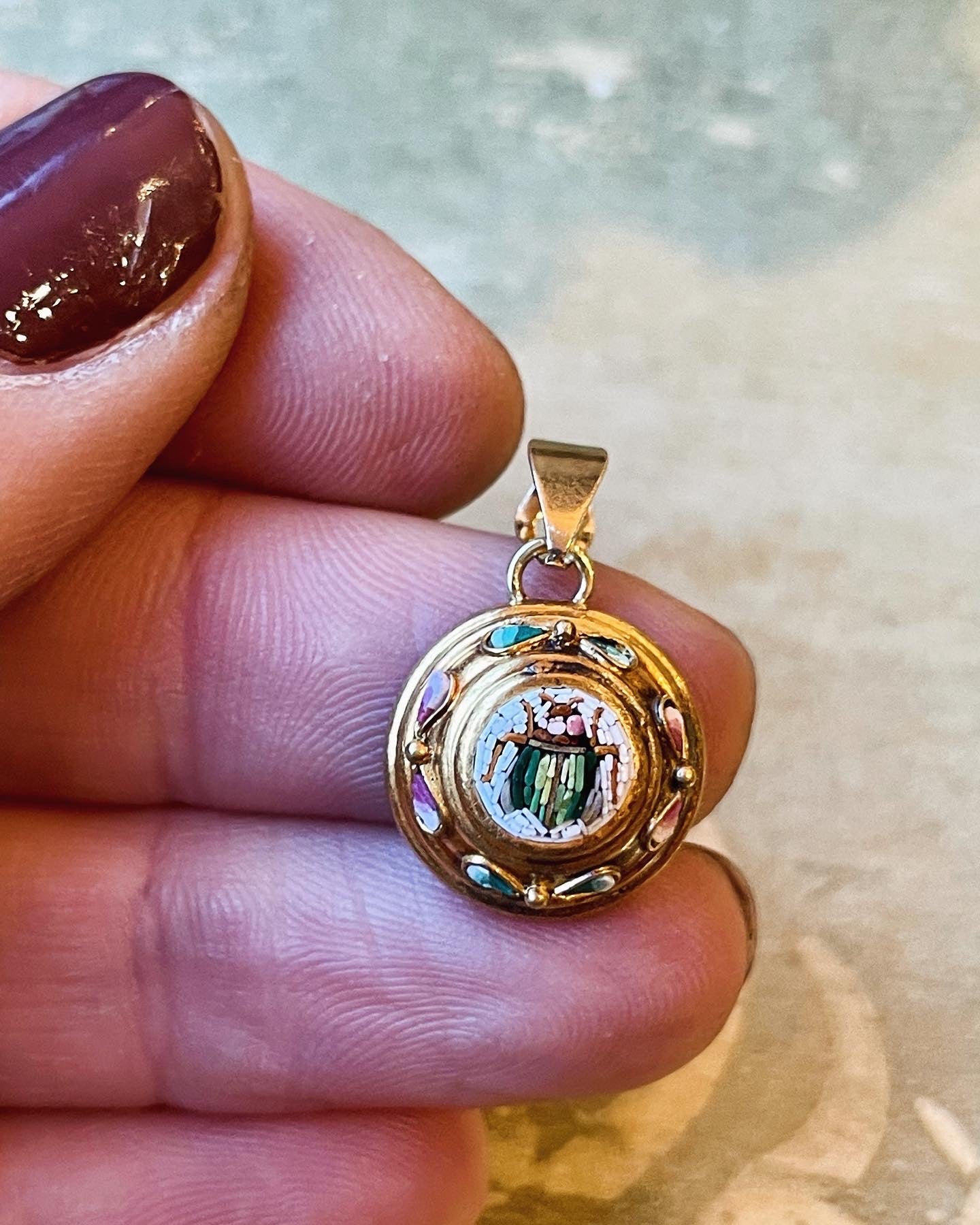 Un pendente straordinario, sia per il soggetto che per il materiale in cui è realizzato: lo scarabeo è il simbolo del gioiello Retour d’Egypte, molto in voga dopo gli scavi napoleonici della Valle dei Re; simbolo di rinascita e saggezza, è uno dei più ricercati ed amati e qui è realizzato in micromosaico minuto, senz’altro opera dell’opificio Vaticano. E’ montato in filled gold.