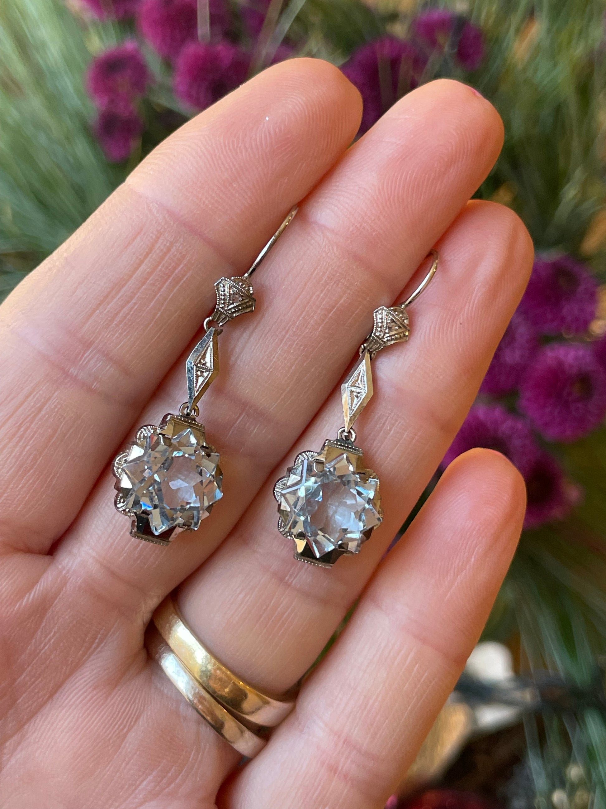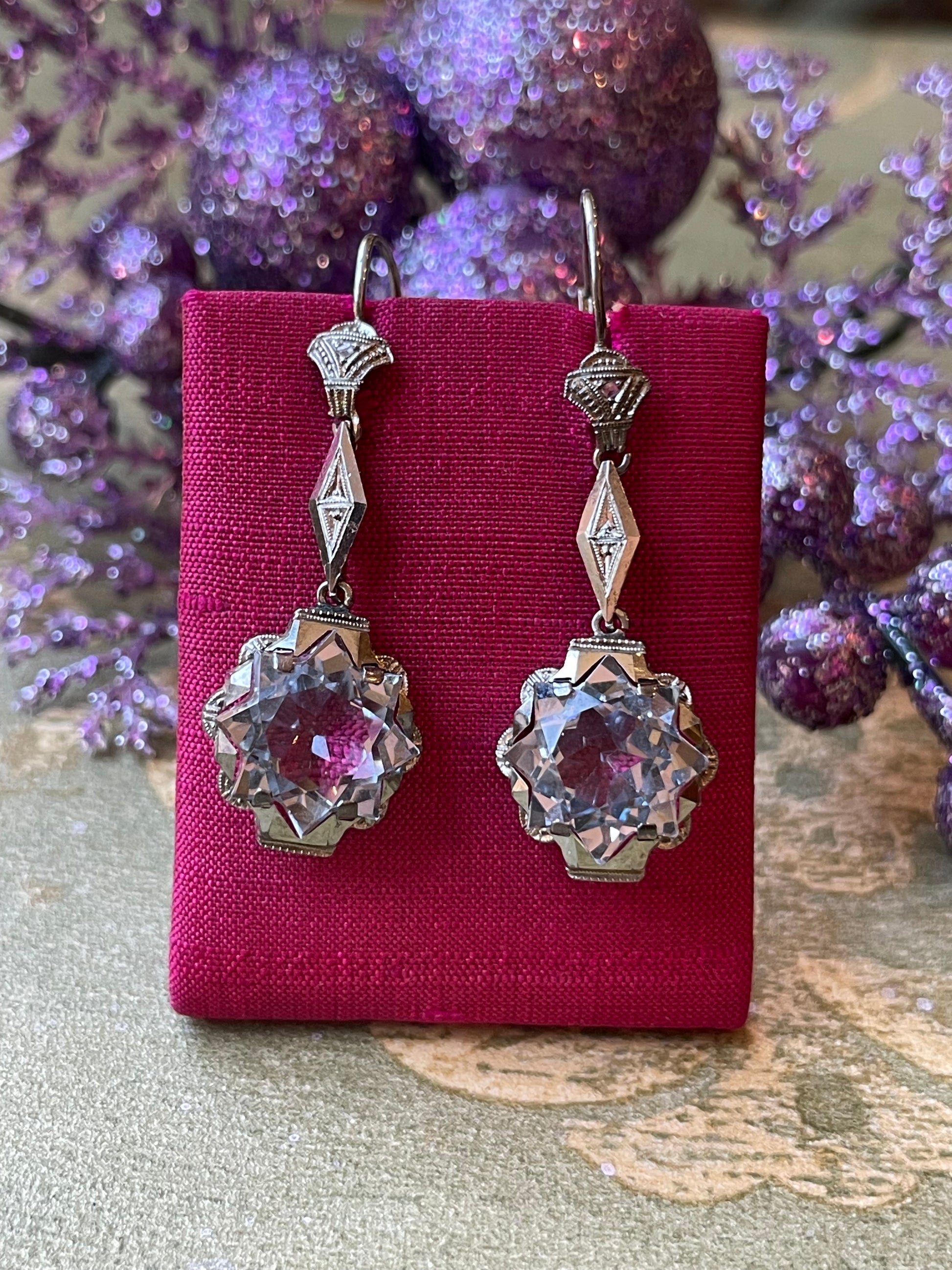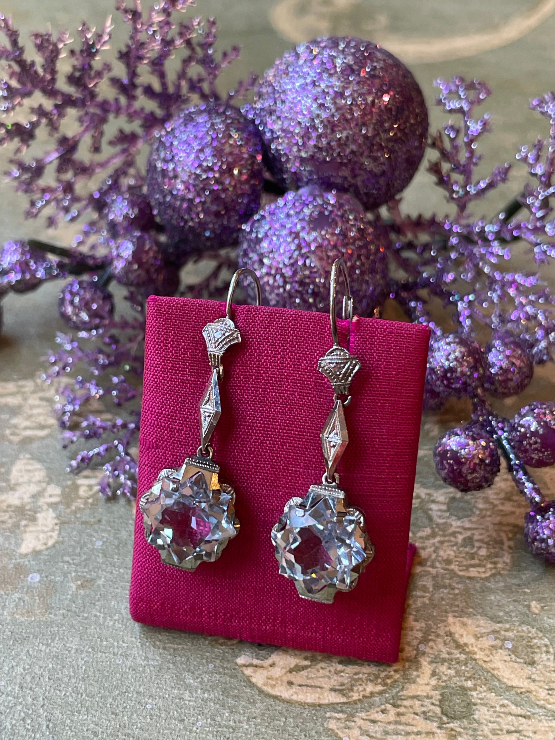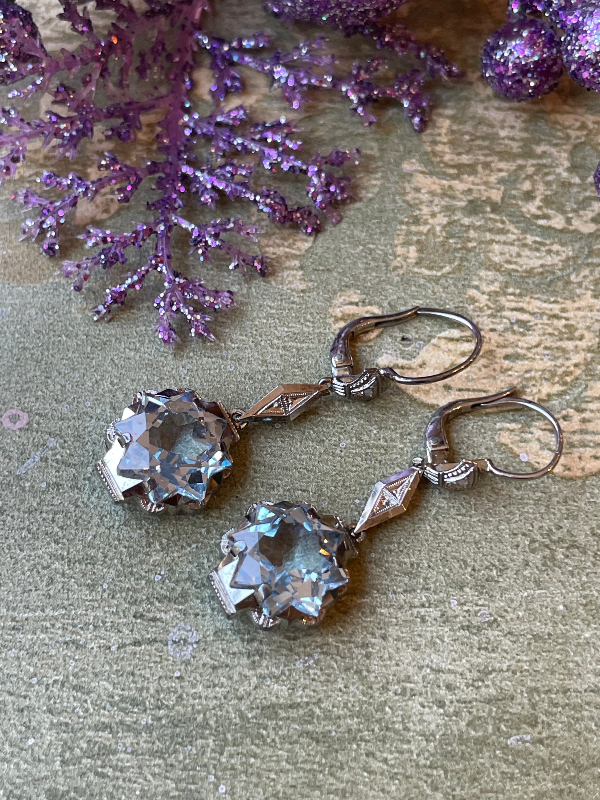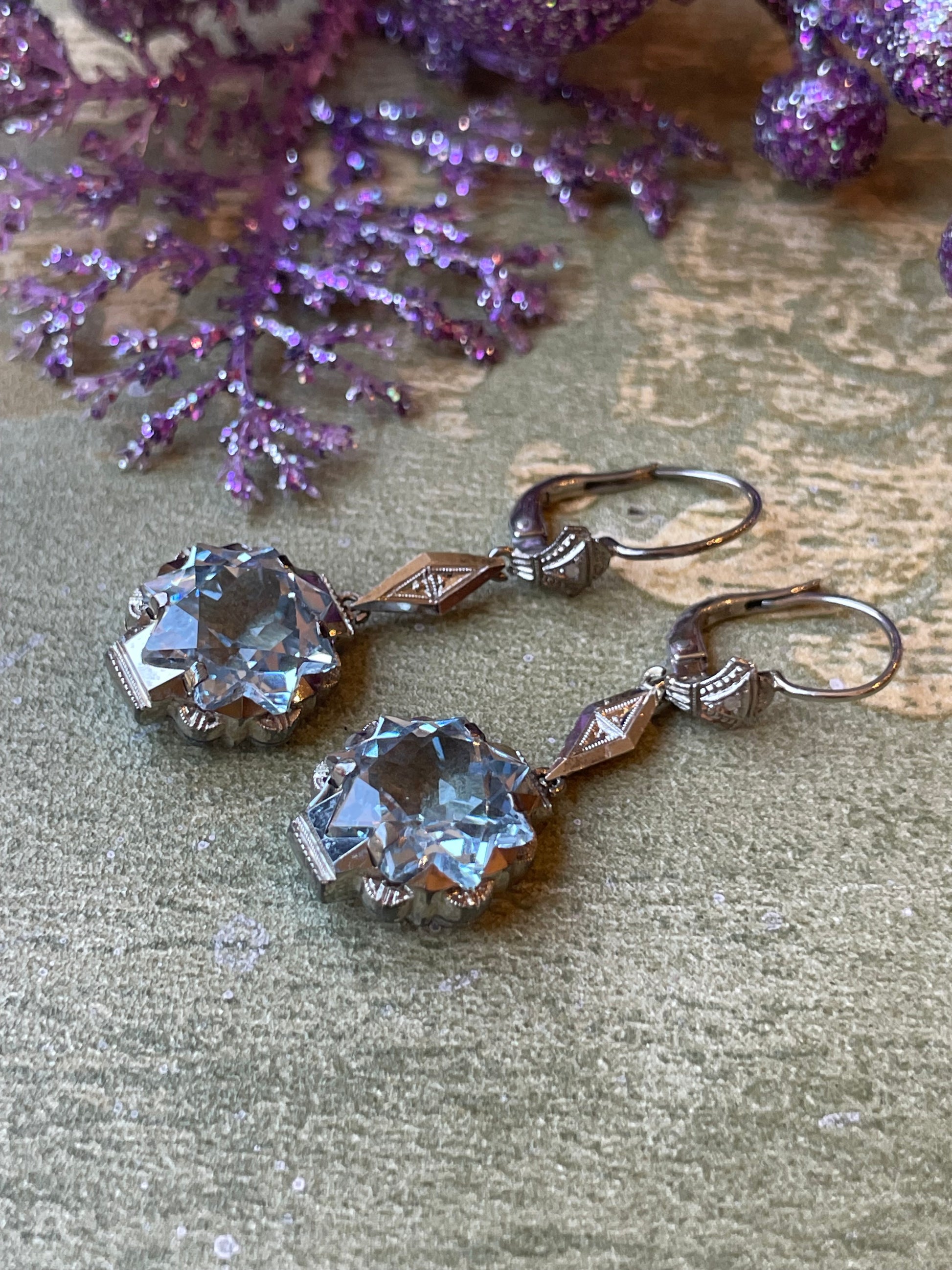 La montatura in oro bianco, lavorato a punta di diamante, è snella e raffinata; i topazi azzurri sono sfaccettati e montati a giorno in una originale cornice a stella; e risplendono di una luce chiara e intensa.