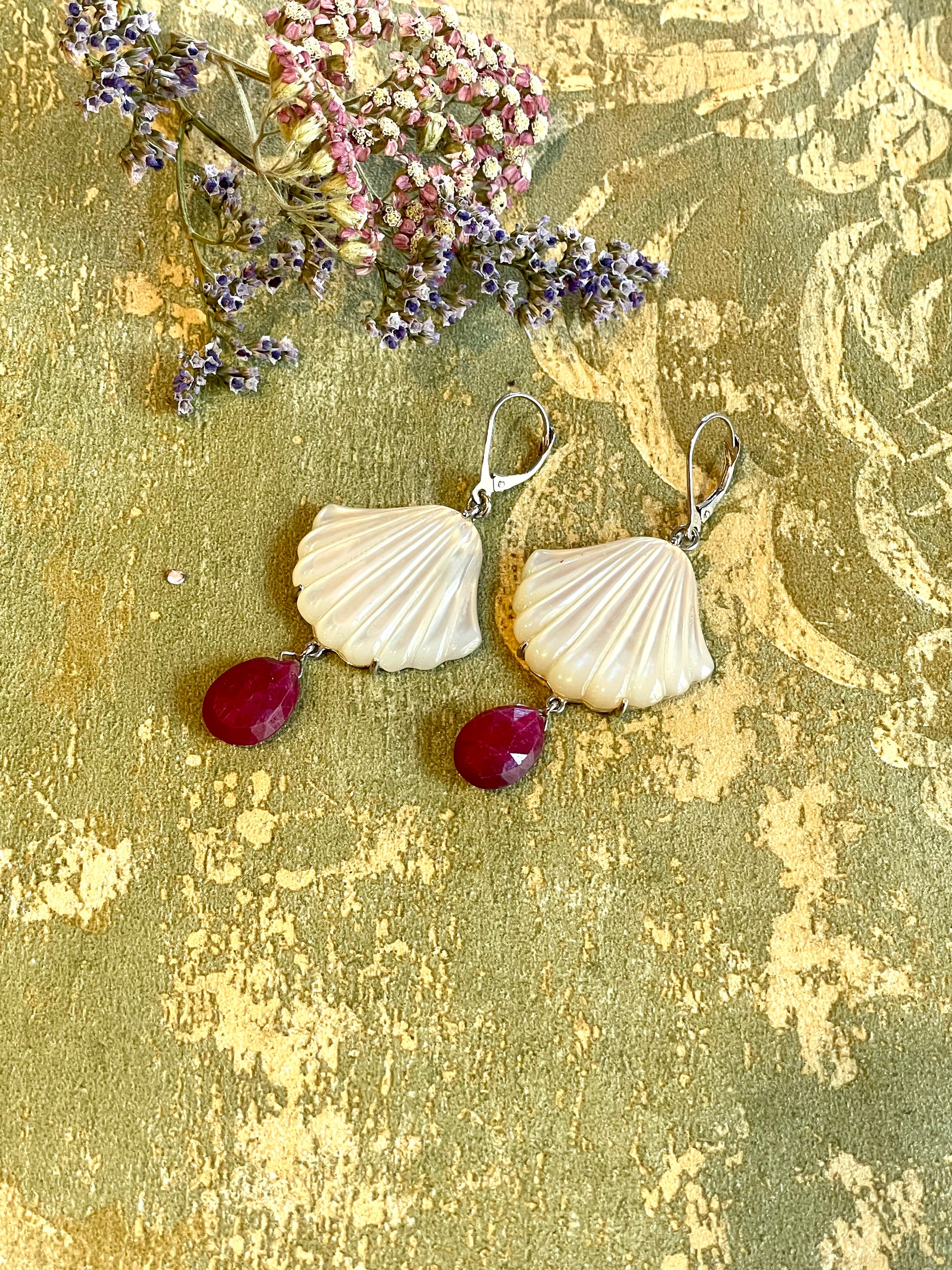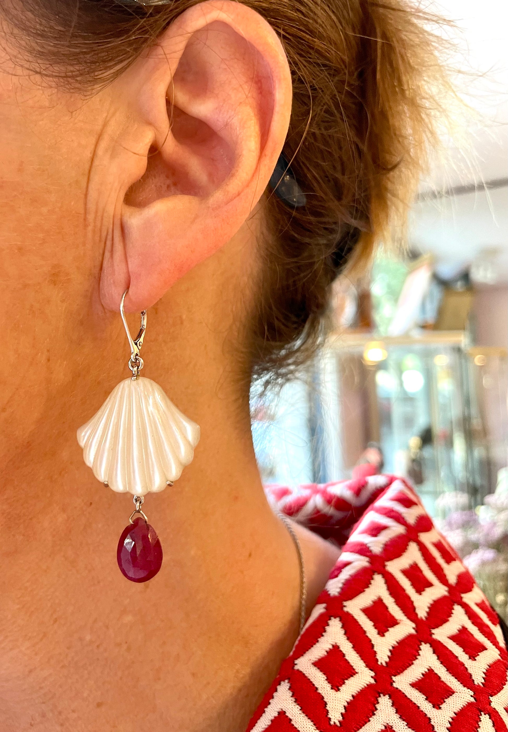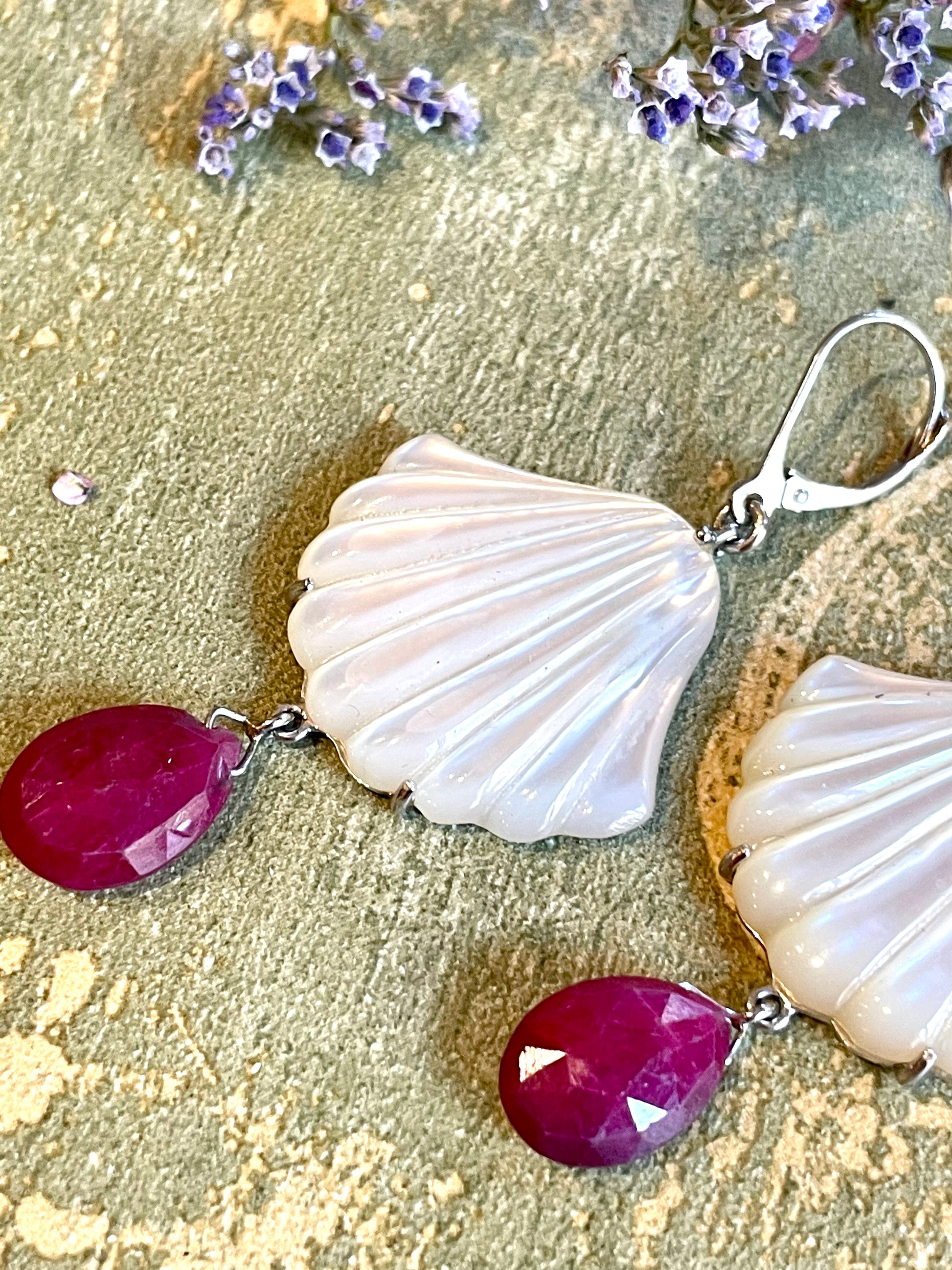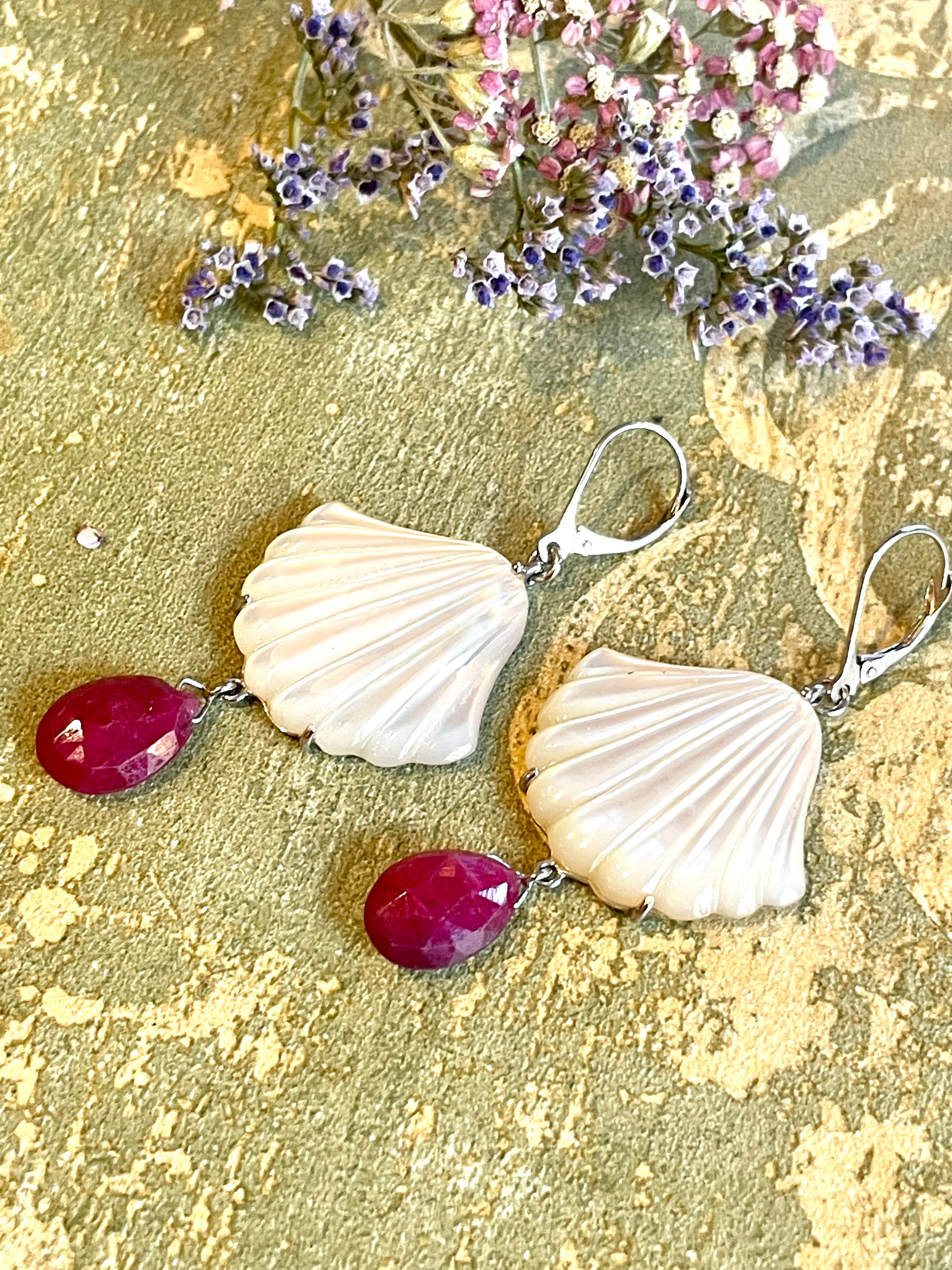 Per gli amanti dei gioielli a tema marino, questi orecchini pendenti sono davvero straordinari: realizzati su una montatura in oro bianco, presentano una elegante conchiglia in madreperla che termina con una goccia di corindone.