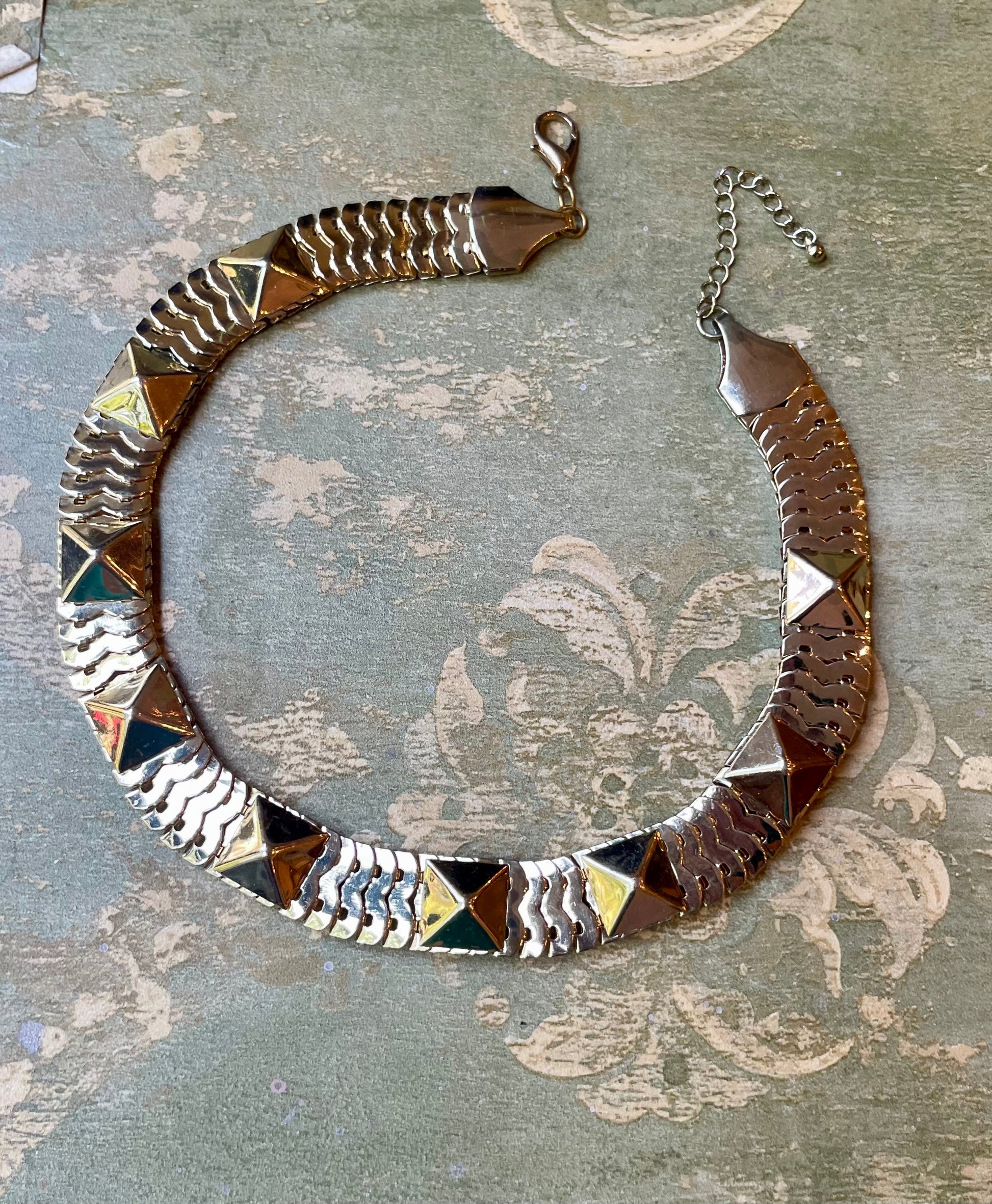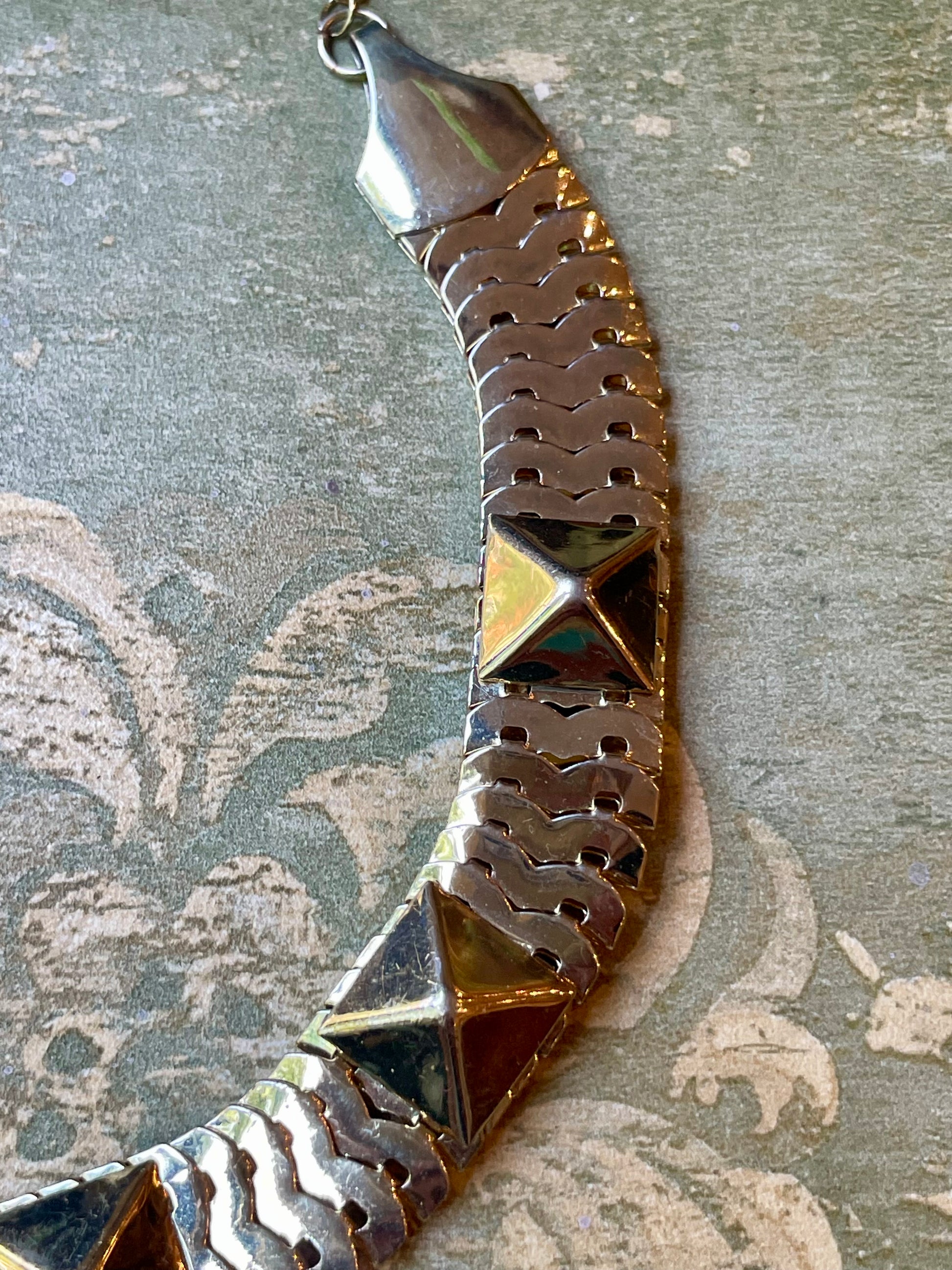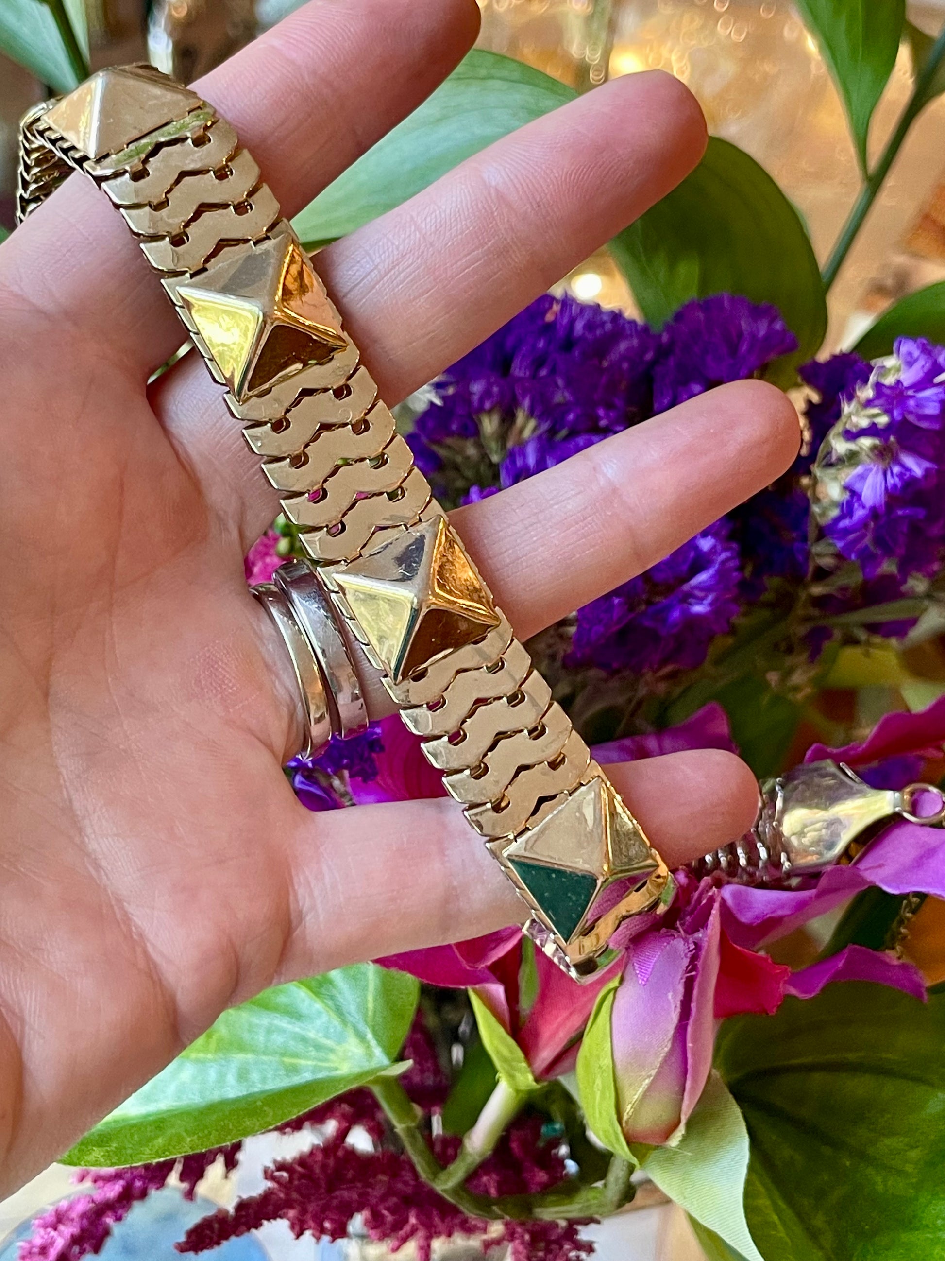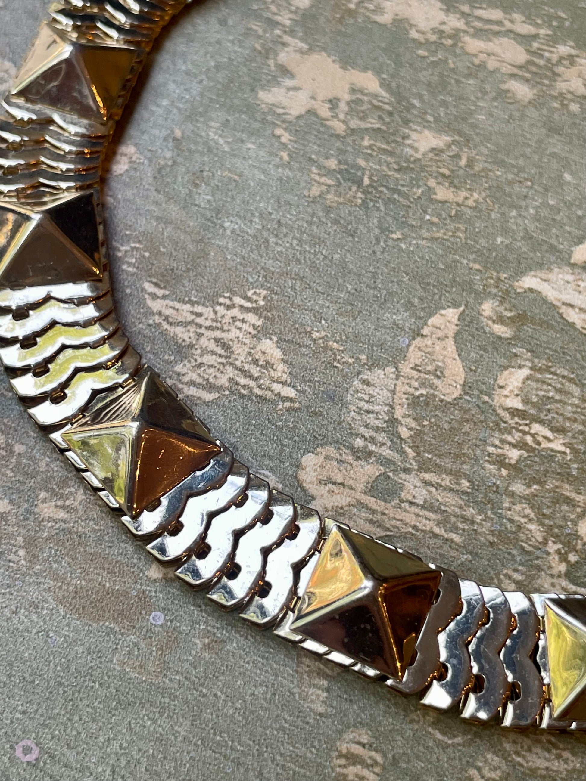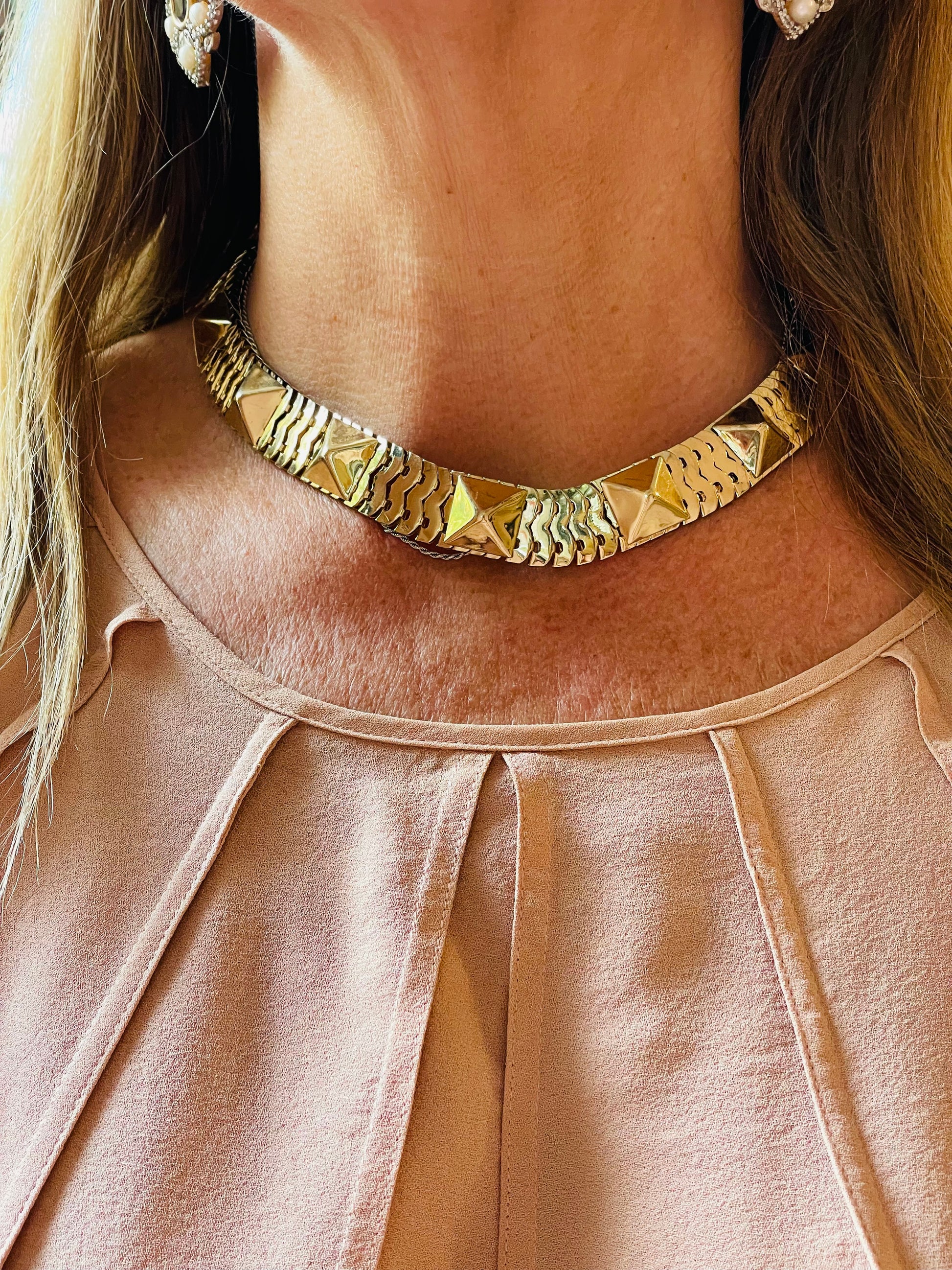 Luminoso, leggero, unico e sofisticato, questo girocollo è caratterizzato da una maglia piatta intervallata da elementi piramidali, che riflettono la luce e conferiscono un colore molto intenso alla doratura. Queste volumetrie e il design rigoroso e geometrico sono tipici dei gioielli Art Deco.