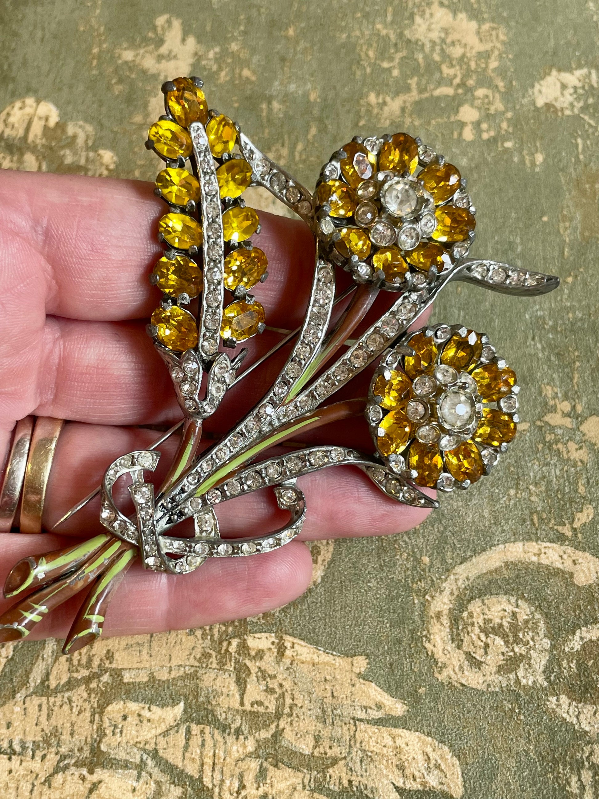 Per chi è alla ricerca di un gioiello scenografico, teatrale, spettacolare, questa spilla è perfetta! Realizzata in una lega di metallo argentato, è formata dai un bouquet floreale di due girasoli ed una spiga di grano, tempestati da cristalli color topazio e bianchi. I rami sono smaltati.