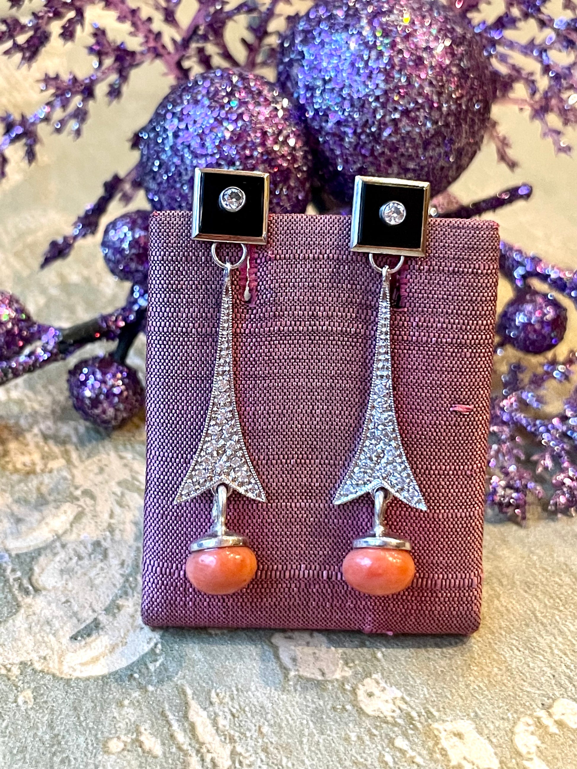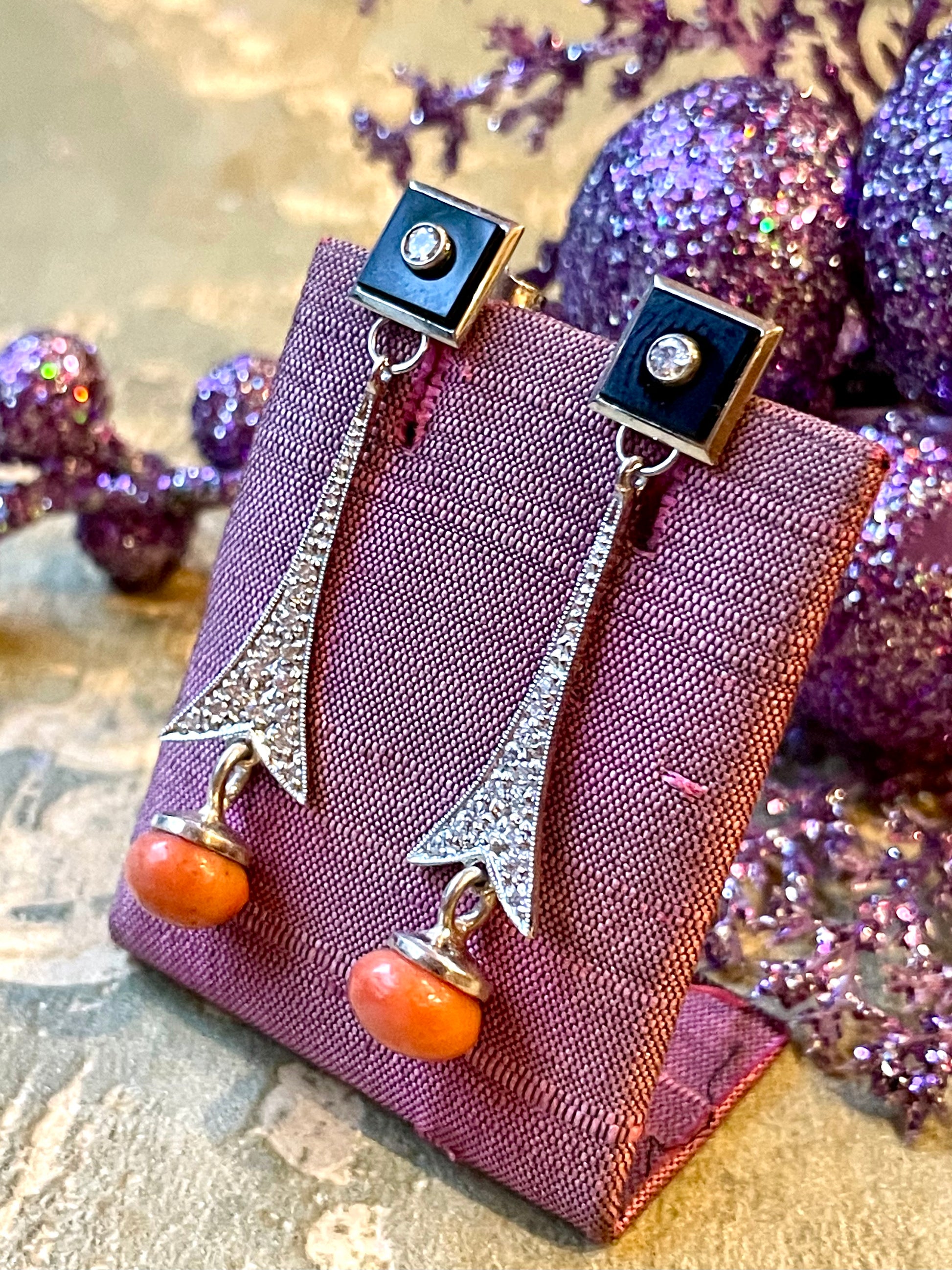 Superbi orecchini Art Deco con diamanti, corallo e smalto nero